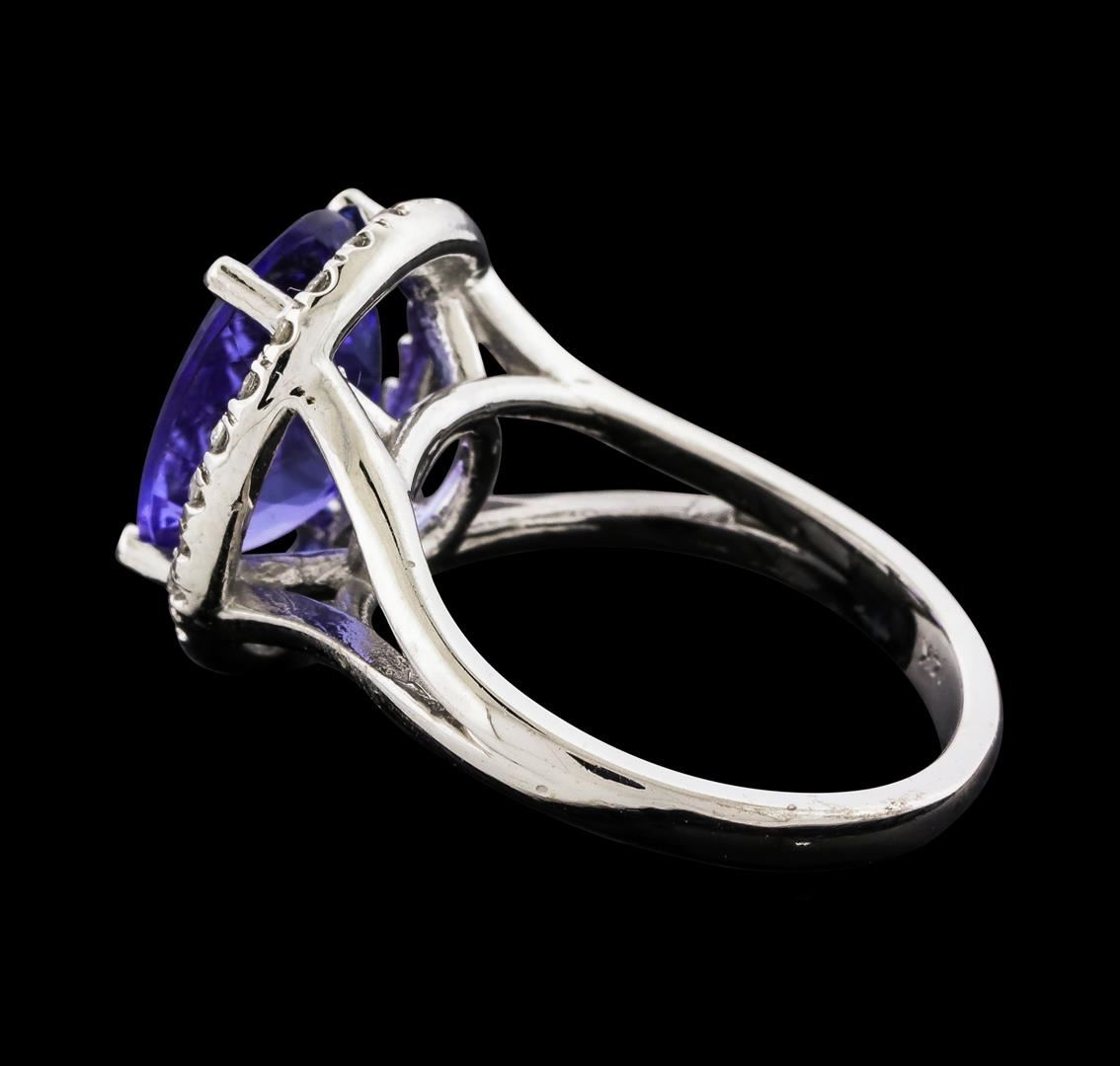 One Tanzanite and Diamond Ring featuring: 14KT White Gold with a total weight of 4.23 grams, One Tanzanite stone with a total weight of 3.38ct, and 24 Diamonds with a total weight of 0.31ctw.