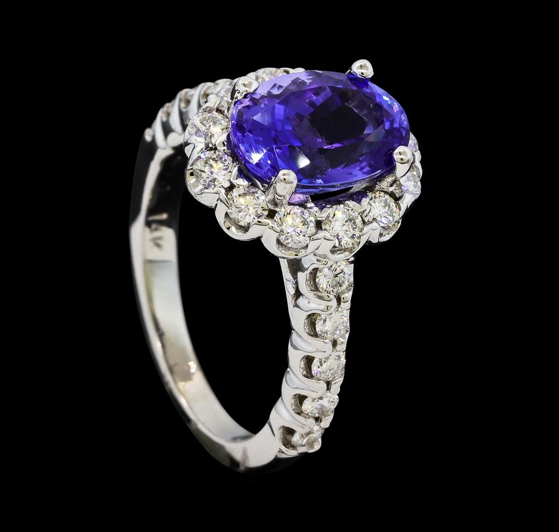One electronically tested 14KT white gold lady's cast fashion ring with a cathedral halo with a bright polish finish. The featured lady's ring has a shank measuring 2.08 millimeters wide. Identified with markings of '14K'. Condition is new, good workmanship. Containing: One prong set oval modified brilliant cut natural tanzanite, measuring 10.55 x 7.40 x 6.00mm, (depth est.) 3%. bulge factor, approximate weight of 3.38ct., clarity is eye clean, medium dark, strong, violetish blue color, (GIA vB 6/5), cut is very good. Transmitting light with no distortion, transparent. Colored gemstones are presumed to have been subjected to commonly used enhancement processes. Graded in the setting. Twelve prong set round brilliant cut diamonds, measuring 2.40 - 2.35 x 1.48mm (depth est.) approximate total weight of 12 Stones = 0.62ct. Graded in the setting. Clarity VS-2 to SI-2. Color: G - H Cut Good Ten prong set round brilliant cut diamonds, measuring 2.10 - 2.05 x 1.29mm (depth est.) approximate total weight of 10 Stones = 0.35ct. Graded in the setting. Clarity SI-1 to SI-2. Color: H - I Cut Good. Total Weight of Colored Stones 3.38ct.. Total Weight of Diamonds 0.97ct.. Total Weight of Ring 5.50gm. GAS Appraised at $9,085.00.