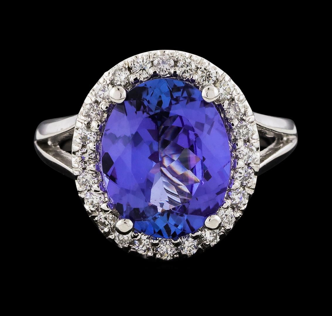 One Tanzanite and Diamond Ring featuring: 14KT White Gold with a total weight of 4.23 grams, One Tanzanite stone with a total weight of 3.38ct, and 24 Diamonds with a total weight of 0.31ctw.