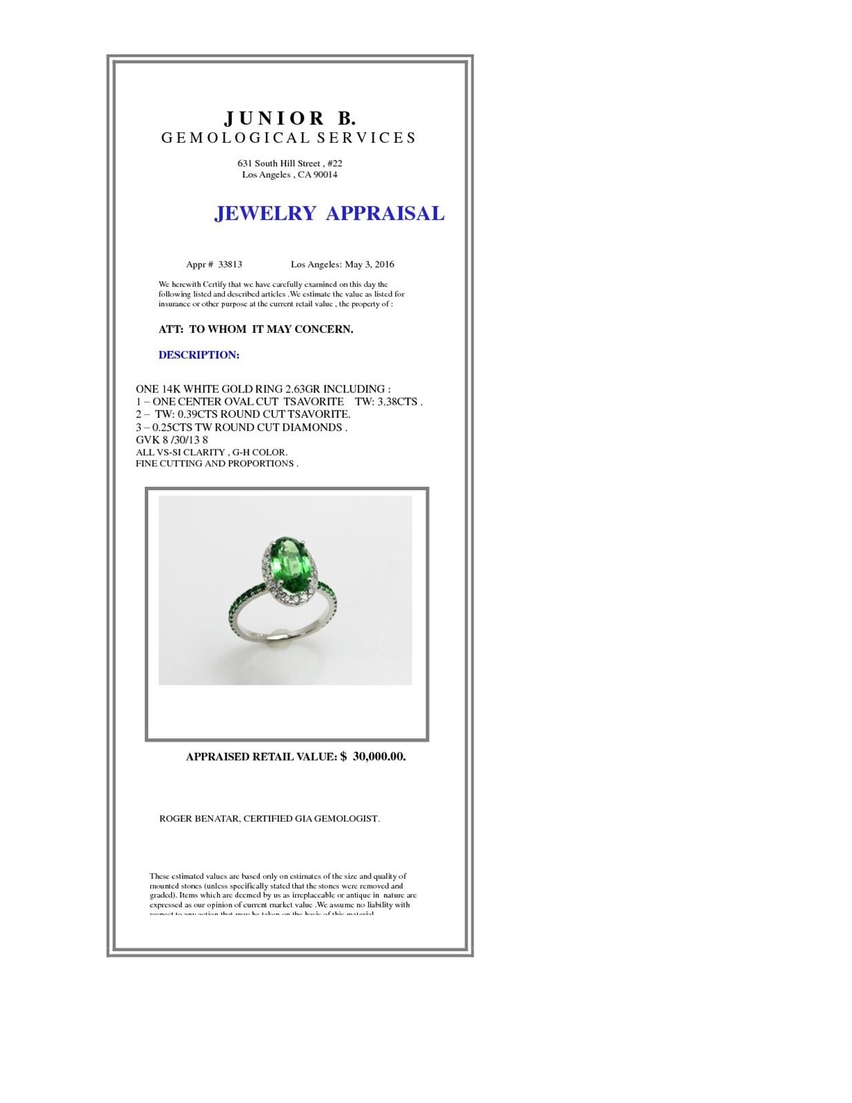 Not all jewelry, watches or loose stones are appraised and the appraisals are provided for bidders only in certain instances at the discretion of the Company. Appraisals, if any should be use to verify gemstone and or metal weights. The appraisals should not be used for valuation of any item. No guarantee, warranty or representation is intended by the Company in any appraisal. All dimensions and weights of such lots are approximate and are consistent with standards and practices in the industry. Condition reports are provided as a service to the prospective buyer. Bidders should take note that such descriptions are not warranties and that watches may need general service, change of battery or further repairs for which the buyer is solely responsible