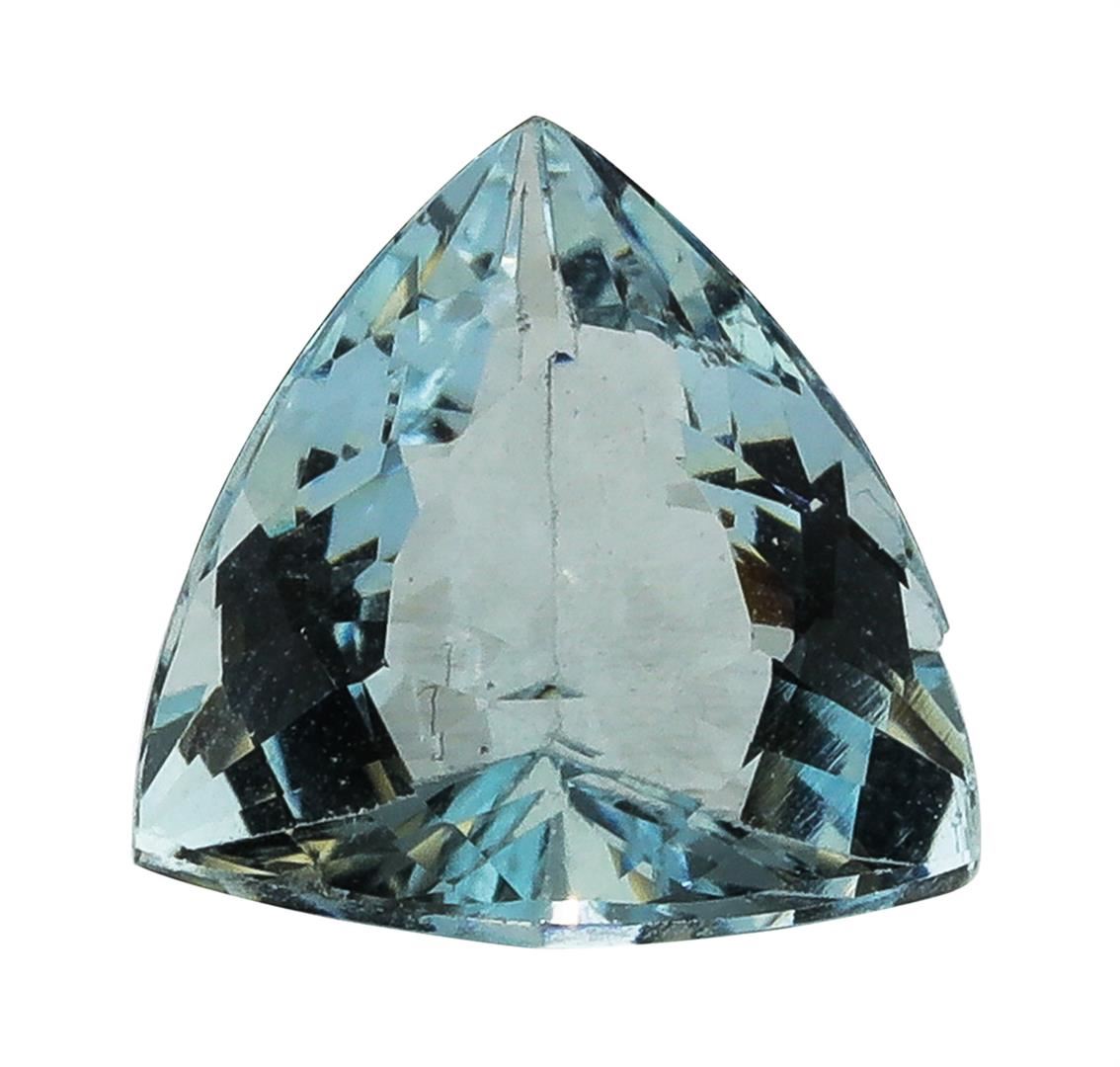 One natural trilliant cut aquamarine with an exact weight of 3.39ct., clarity is eye clean, slightly grayish greenish blue, medium light. Gemological Appraisals Services estimates the retail value at $1305.15 GAS Appraised.