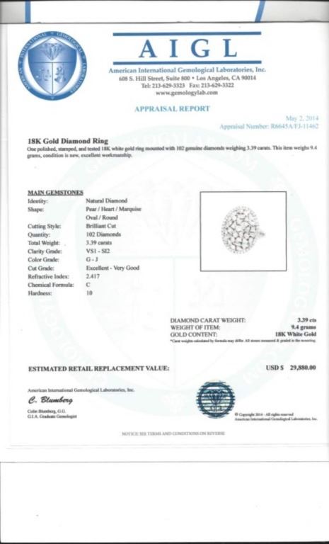 Regarding Appraised Jewelry and Loose Stones - Auctionfarm sends them out to a third party for Retail Replacement Value Appraisals, which are the most common. These types of evaluations are written for insurance needs. This would be the cost to replace the jewelry with an item of equal quality and kind, considered to be the current market price or the replacement value. This type of appraisal is done to protect you in the event of damage or loss of a valuable item. Our appraisals are conducted by independent 3rd Party appraisal firms that utilizes Certified GIA Gemologist. Appraisals should be used for verification of gemstone and/or metal weight, size, and grade only, not actual value. Appraisal value should be considered for insurance purposes only, not actual value, as price varies greatly from retail locations thru out the world. Items should not be purchased with the expectation to resell for appraisal price, or for profit.