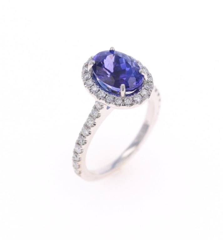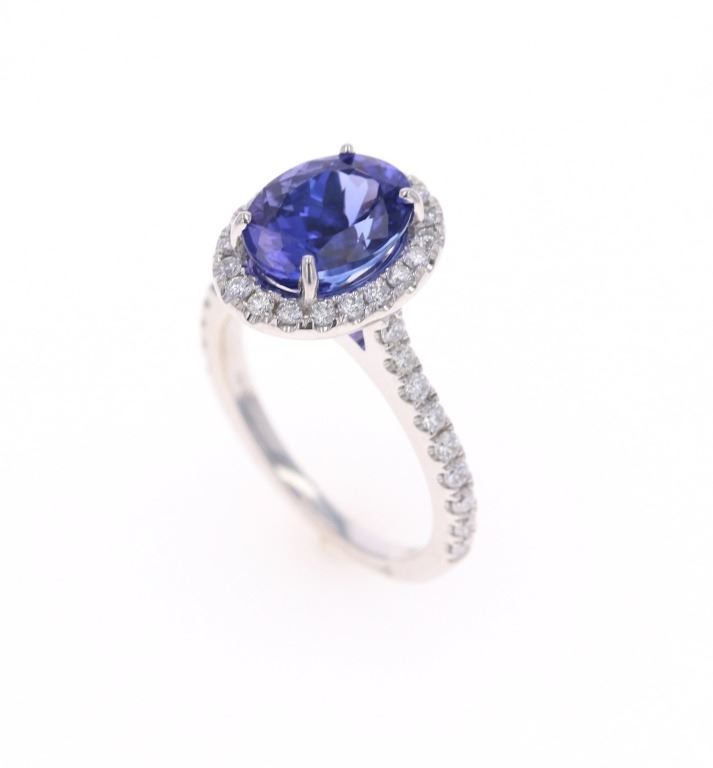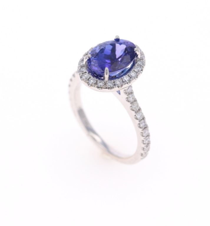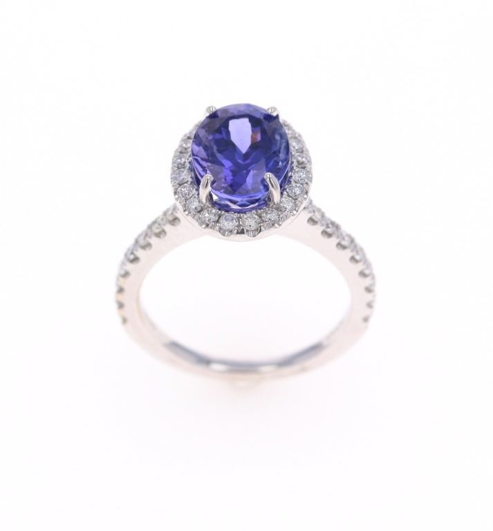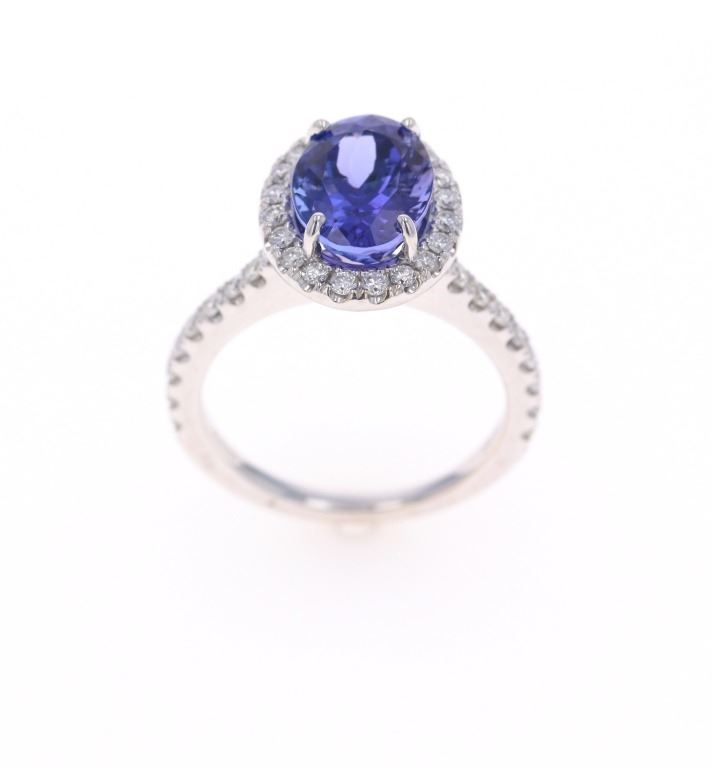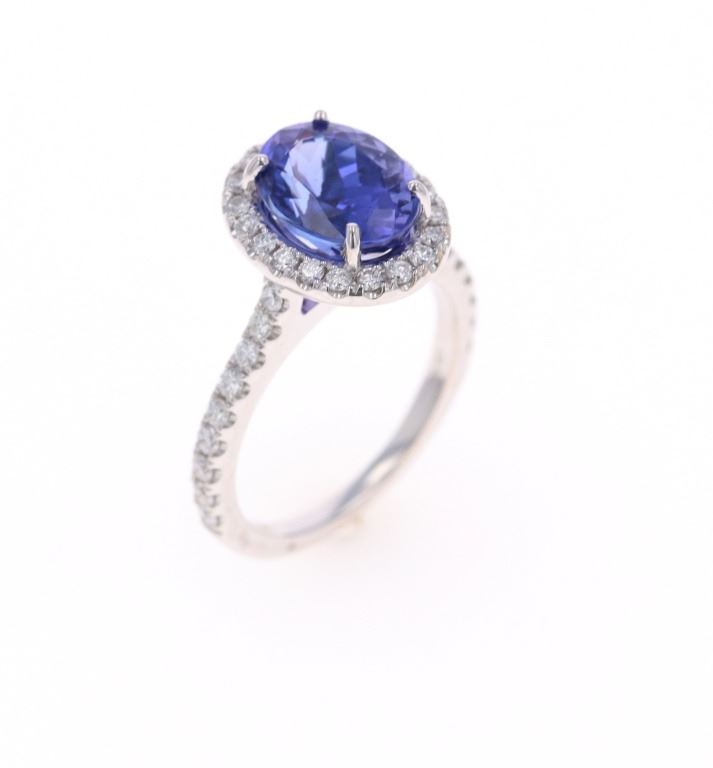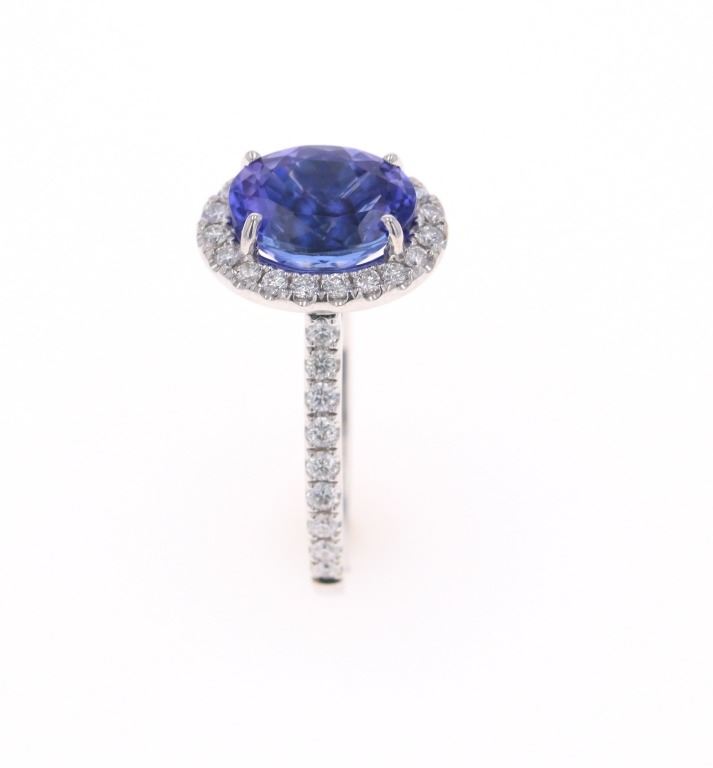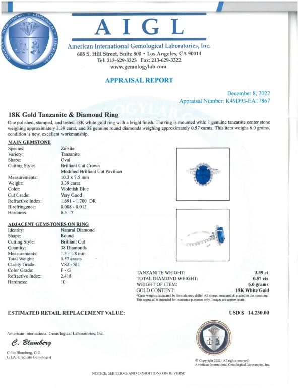 Featured in this lot is a 3.39ct tanzanite VS2 diamond and 18k white gold ring with AIGL paperwork. The ring features a wonderfully and professionally crafted 18k white gold construction that shows an 'HANA' hallmark with an '18k' gold stamp next to the hallmark. The center stone is an oval brilliant cut crown modified brilliant cut pavilion that shows measurements of 10.2 x 7.5mm with violet-blue coloration. The center stone shows a very good cut grade and a total weight of 3.39 carats. The center stone and pave set shoulders are decorated with a total of 38 round brilliant cut diamonds that shows measurements of 1.3 - 1.8mm and a clarity of VS2 - SI1 and a color grade of F - G with a total weight of 0.57 carats. The piece comes complete with AIGL Inc.(American International Gemological Laboratories, Inc. a GIA certified lab AIGL#: K49D93-EA17867) report and appraisal confirming the above info and giving a total value of $14,230.00. The ring size is US 6 1/2. RN031546.*