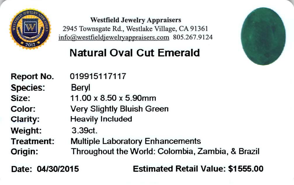 One oval cut natural emerald, measuring 11.00 x 8.50 x 5.90mm, exact weight 3.39ct., clarity is heavily included, type III, medium dark, very slightly grayish, very slightly bluish green color, (GIA vslbG 6/3), cut is good. Westfield Appraised at $1,555.00.
