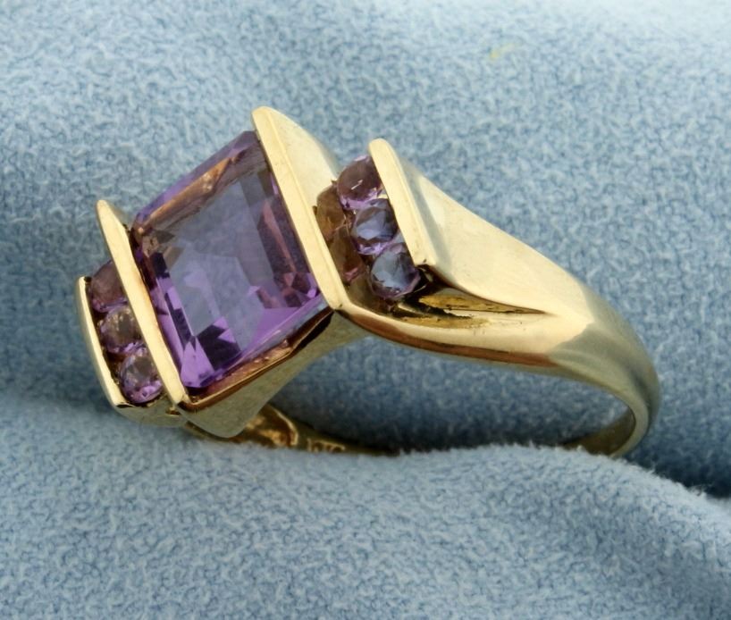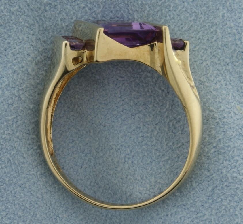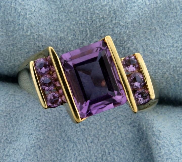 In 10k yellow gold. Contains a 3ct Emerald cut natural amethyst with a bright purple color and excellent clarity. Also contains six round .05ct natural amethyst gemstones of similar quality. Size 10 1/2. 4.5g.