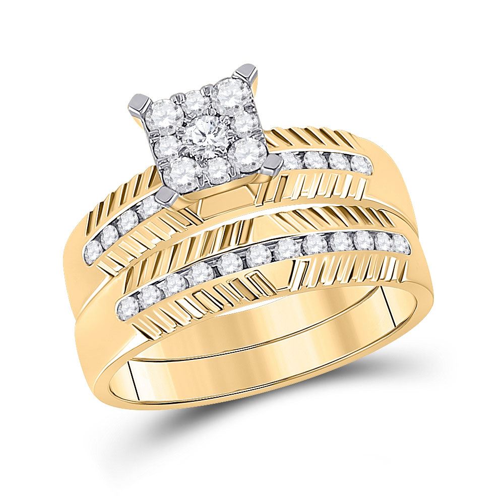 14kt Yellow Gold His & Hers Round Diamond Cluster Matching Bridal Wedding Ring Band Set 3/4 Cttw