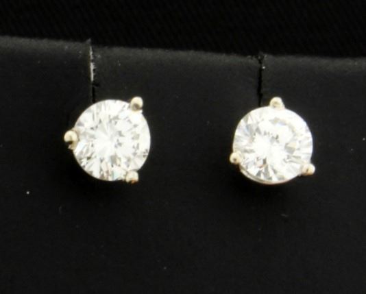 The brilliant cut very high quality diamonds have a clarity of VS and a color of G. The mountings are martini style (3-prong) that fit close to the ear. The backs are PLATINUM medium weight and come with friction backs 1.0g