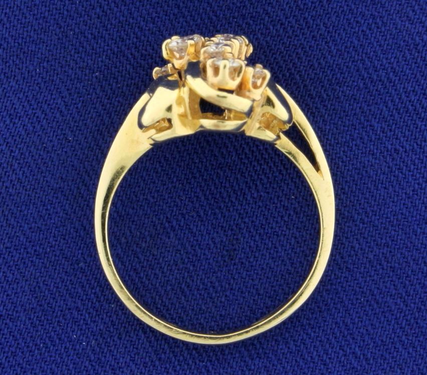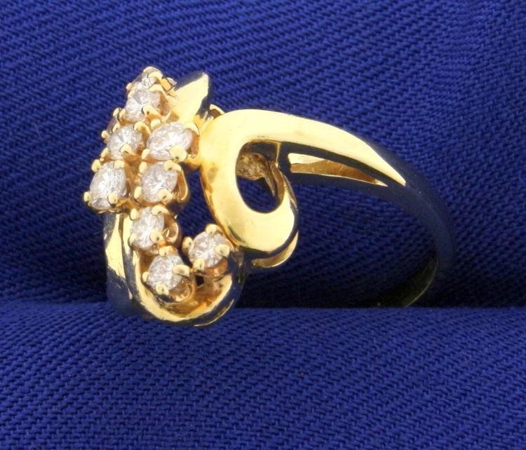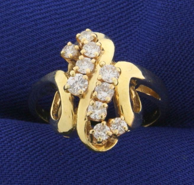 In 14k Yellow gold. The ring contains 3/4 carat of high quality round brilliant cut diamonds with SI clarity and H color. The ring is almost 3/4" long and 1/2" wide. Size 6. 5.0g