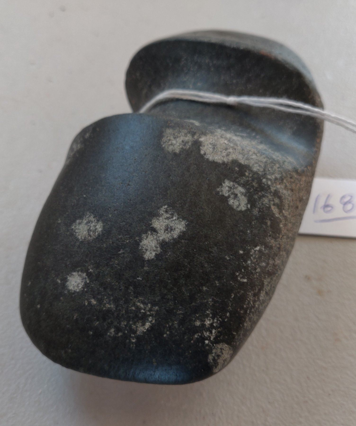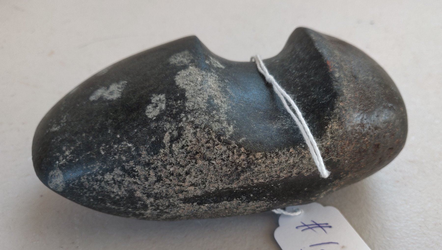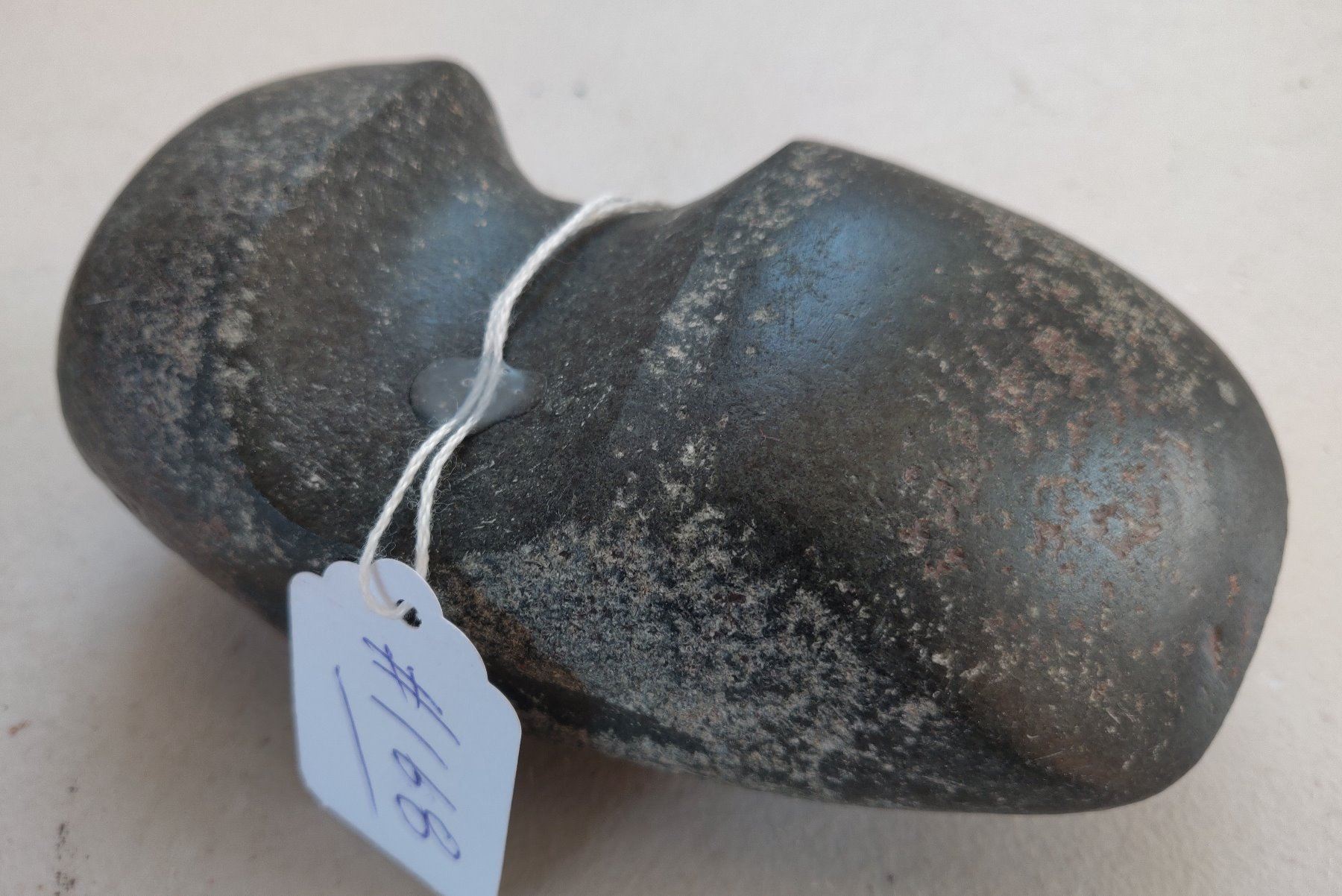 3/4 Groove Stone Axe, pre-historic item. Made of basalt, made of 5" x 2 1/2" x 2 1/2". Hohokam, Ajo, Pima County, Arizona. Flute on bottom, deep groove. Condition: Good, polished item, see images. Shipping: $24.50 w/insurance and signature, due to value.