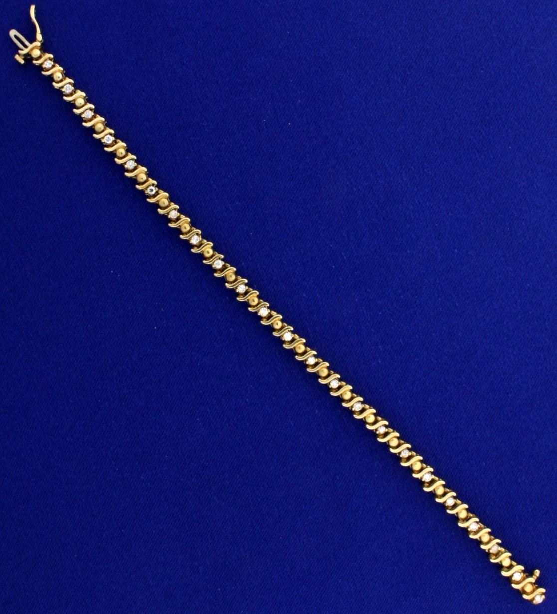 This beautiful diamond bracelet is set in 14k yellow gold. There is a total of 3/4 ct of high quality SI clarity and I color round brilliant diamonds. 7 3/8 inches long. 15.4g