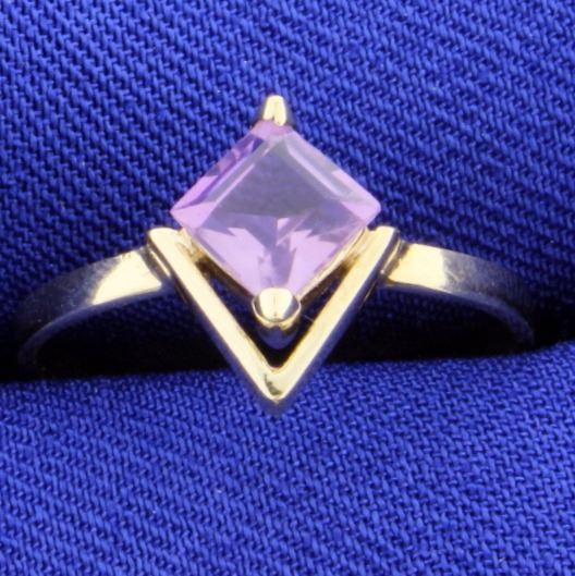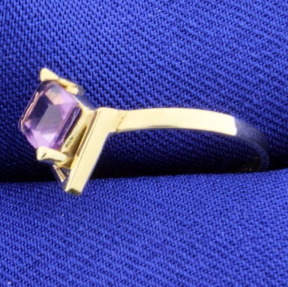 In 14k yellow gold this ring has a square amethyst gemstone that is 5mmx5mm with excellent color and clarity. Size 6 1/2      1.7g
