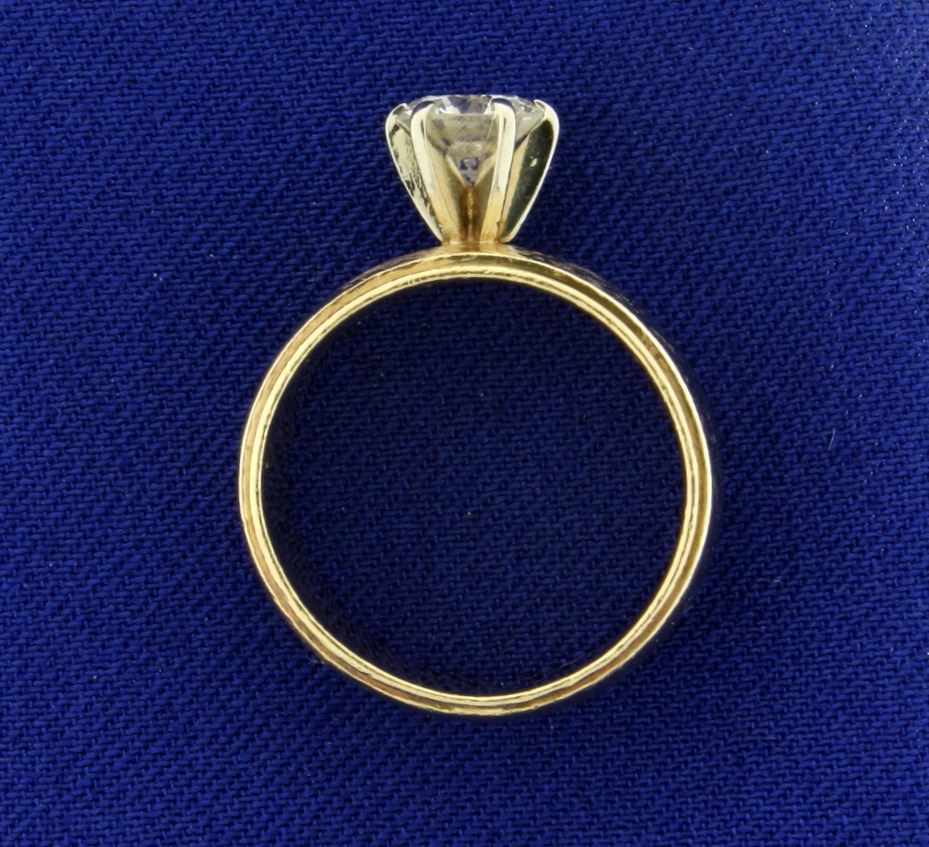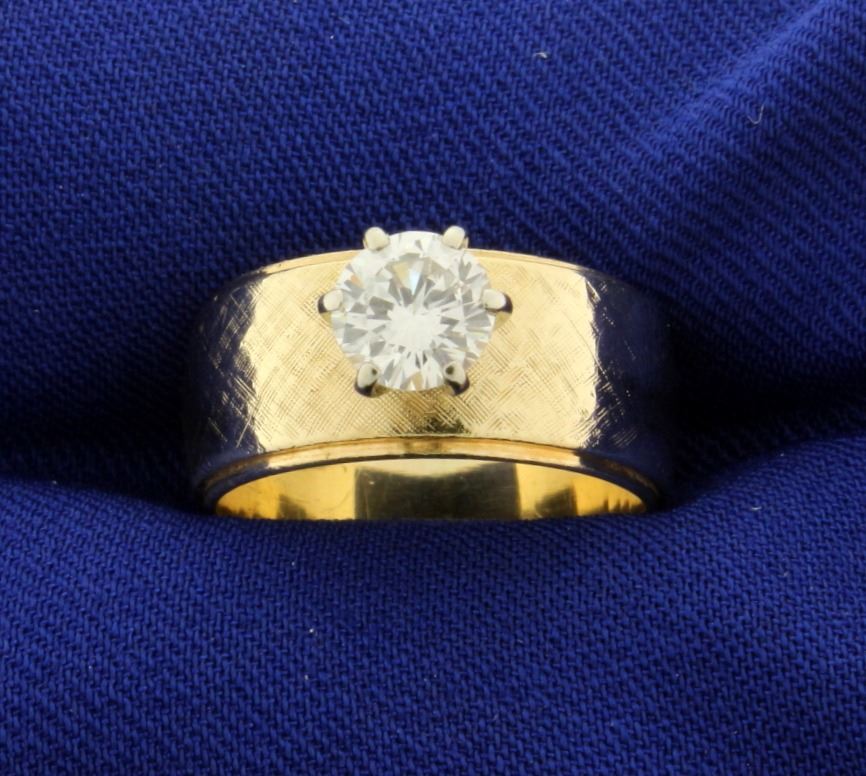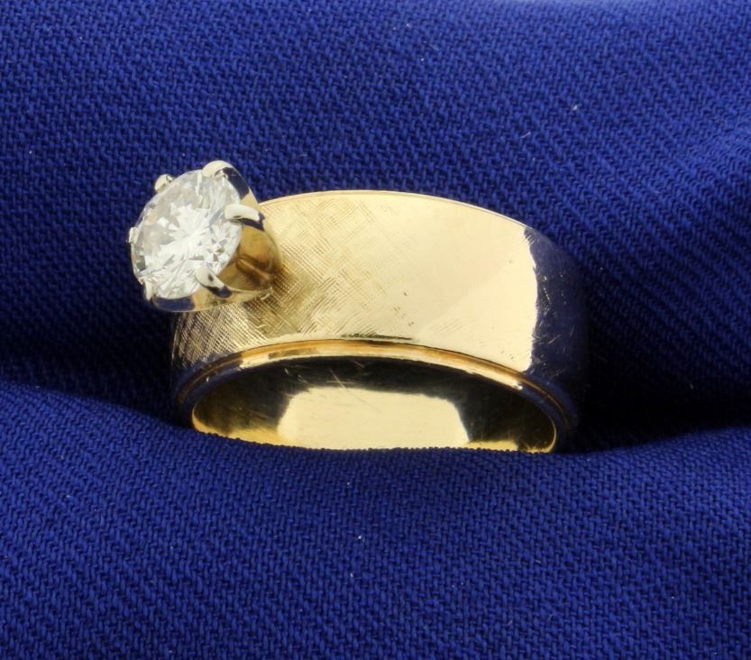 In 14k gold. The diamond is a high quality diamond with a clarity of VS2 and a color of F, with lots of sparkle. Size 6. 8.0g.