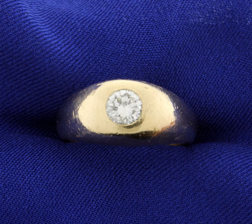 In 14k Yellow Gold. Contains 3/4 ct High Quality Round Brilliant Diamond with SI Clarity and H Color. Great life and sparkle. Size 9. 9.5g