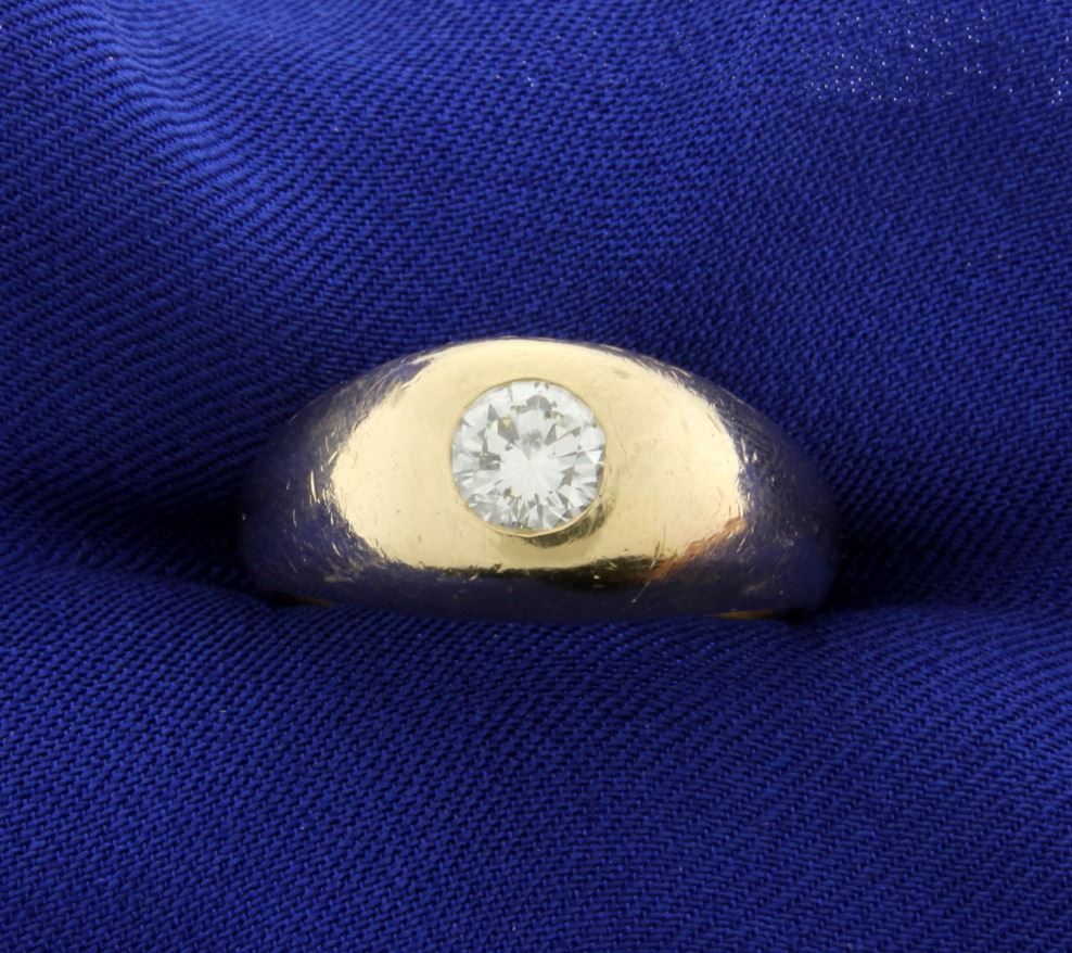 In 14k Yellow Gold.  Contains 3/4 ct High Quality Round Brilliant Diamond with SI Clarity and H Color.  Great life and sparkle.  Size 9.  9.5g
