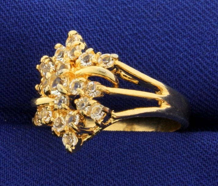 In 14k yellow gold. Center CZ is .1ct surrounded by twenty .03ct to .04ct gemstones. Size 6 1/2. 3.5g.