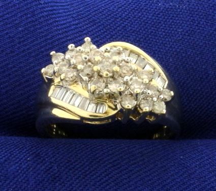 In 10k yellow gold. Contains twenty one round high quality diamonds ranging from .02 to .04cts each and fourteen high quality baguette .02ct diamonds, all J color/I clarity. Size 7 3/4. 5.0g.