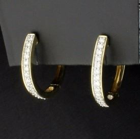 In 14K yellow gold, they are 7/8 inch in diameter. Each earring contains seventeen high quality round diamonds, SI clarity/G color, for a total weight of 3/4 cts. 4.8g