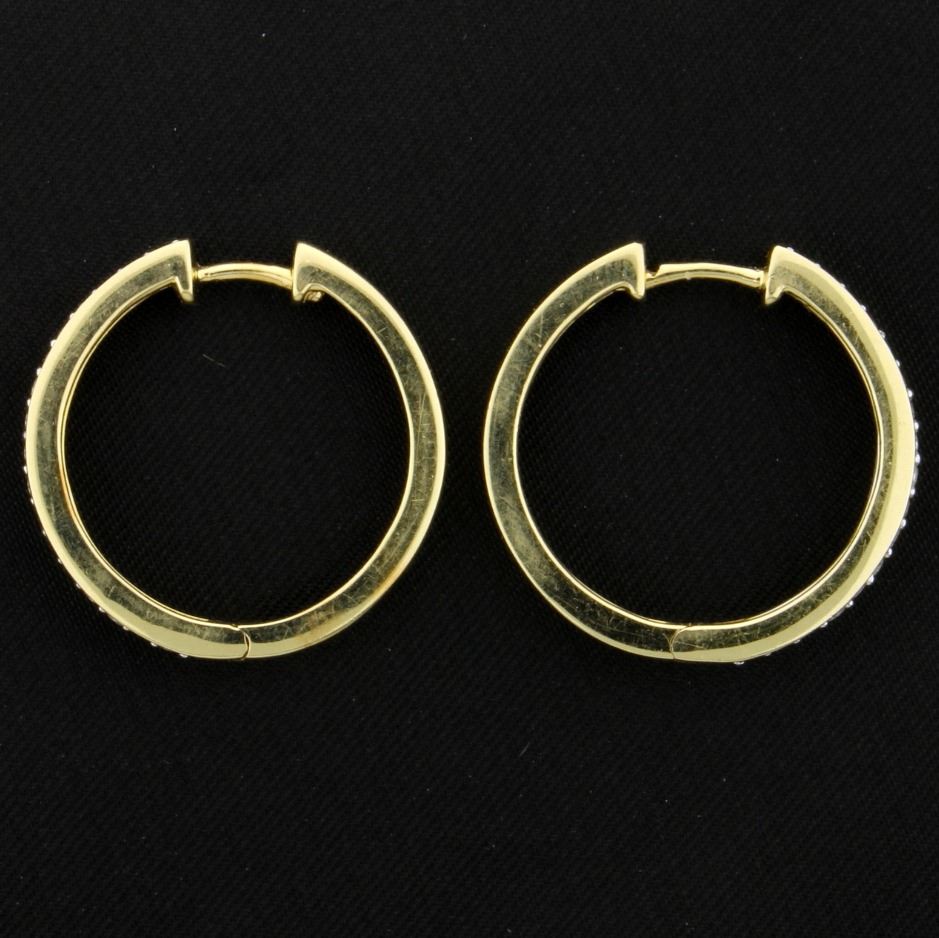 In 14K yellow gold, they are 7/8 inch in diameter. Each earring contains seventeen high quality round diamonds, SI clarity/G color, for a total weight of 3/4 cts. 4.8g