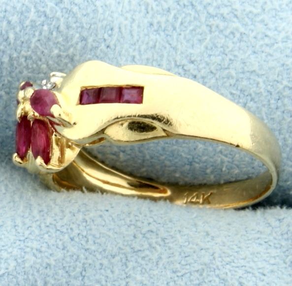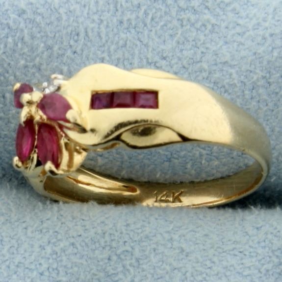 In 14K yellow gold. This ring contains four 4x2mm marquise and six 2mm square ruby gemstones. Also there is one .01ct round diamond. Size 6 1/2 3.1g