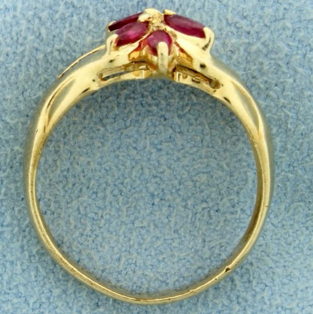 In 14K yellow gold. This ring contains four 4x2mm marquise and six 2mm square ruby gemstones. Also there is one .01ct round diamond. Size 6 1/2 3.1g