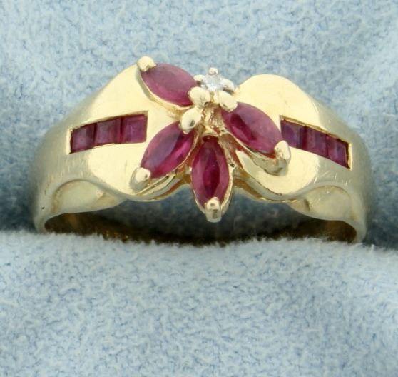 In 14K yellow gold. This ring contains four 4x2mm marquise and six 2mm square ruby gemstones. Also there is one .01ct round diamond. Size 6 1/2 3.1g