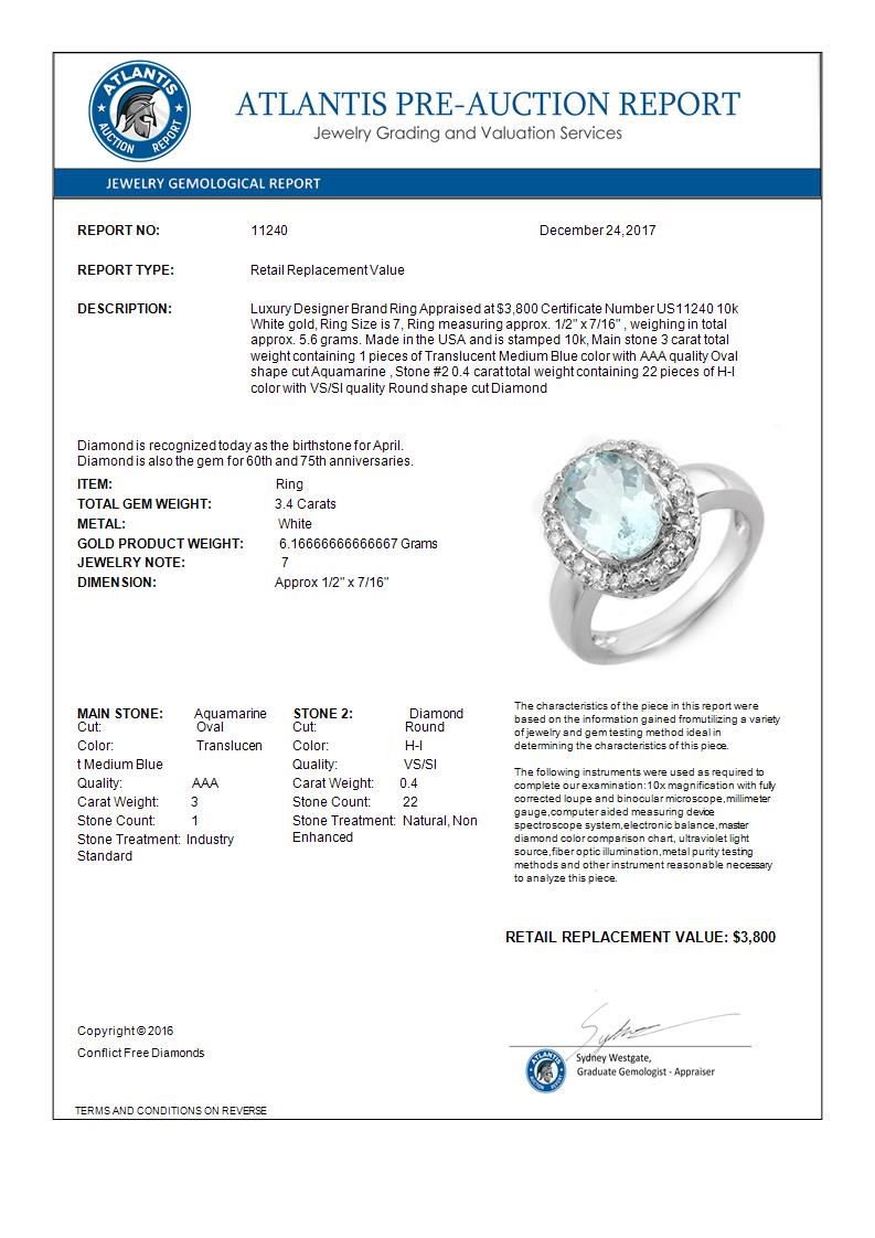 REF-57X5T -11240 ---- 3.40 CTW Aquamarine & Diamond Ring 10K White Gold ---- Luxury Designer Brand Ring Appraised at $3,800 Certificate Number US11240 10k White gold, Ring Size is 7, Ring measuring approx. 1/2" x 7/16" , weighing in total approx. 5.6 grams. Made in the USA and is stamped 10k, Main stone 3 carat total weight containing 1 pieces of Translucent Medium Blue color with AAA quality Oval shape cut Aquamarine , Stone #2 0.4 carat total weight containing 22 pieces of H-I color with VS/SI quality Round shape cut Diamond