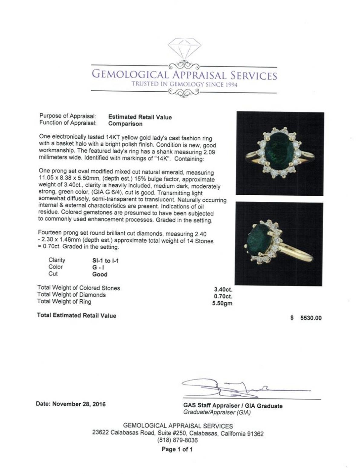 One electronically tested 14KT yellow gold lady's cast fashion ring with a basket halo with a bright polish finish. The featured lady's ring has a shank measuring 2.09 millimeters wide. Identified with markings of '14K'. Condition is new, good workmanship. Containing: One prong set oval modified mixed cut natural emerald, measuring 11.05 x 8.38 x 5.50mm, (depth est.) 15%. bulge factor, approximate weight of 3.40 ct., clarity is heavily included, medium dark, moderately strong, green color, (GIA G 6/4), cut is good. Transmitting light somewhat diffusely, semi-transparent to translucent. Naturally occurring internal & external characteristics are present. Indications of oil residue. Colored gemstones are presumed to have been subjected to commonly used enhancement processes. Graded in the setting. Fourteen prong set round brilliant cut diamonds, measuring 2.40 - 2.30 x 1.46mm (depth est.) approximate total weight of 14 Stones = 0.70 ct. Graded in the setting. Clarity SI-1 to I-1. Color: G - I Cut Good. Total Weight of Colored Stones 3.40 ct.. Total Weight of Diamonds 0.70 ct.. Total Weight of Ring 5.50gm. GAS Appraised.