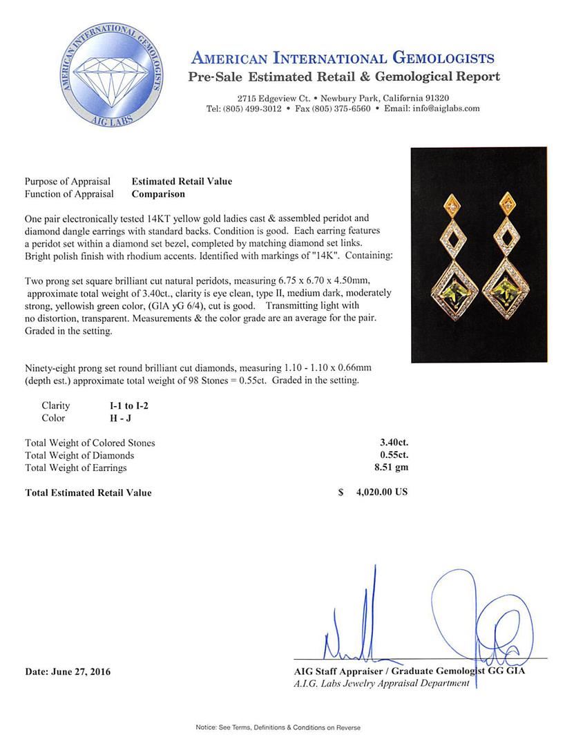 One pair electronically tested 14KT yellow gold ladies cast & assembled peridot and diamond dangle earrings with standard backs. Each earring features a peridot set within a diamond set bezel, completed by matching diamond set links. Bright polish finish with rhodium accents. Identified with markings of "14K". Condition is good. Containing: Two prong set square brilliant cut natural peridots, measuring 6.75 x 6.70 x 4.50mm, approximate total weight of 3.40ct., clarity is eye clean, type II, medium dark, moderately strong, yellowish green color, (GIA yG 6/4), cut is good. Transmitting light with no distortion, transparent. Measurements & the color grade are an average for the pair. Graded in the setting. Ninety-Eight prong set round brilliant cut diamonds, measuring 1.10 - 1.10 x 0.66mm (depth est.) approximate total weight of 98 Stones = 0.55ct. Graded in the setting. Clarity: I-1 to I-2. Color: H - J. Total Weight of Colored Stones 3.40ct. Total Weight of Diamonds 0.55ct. Total Weight of Earrings 8.51gm. AIG Appraised at $4,020.00.