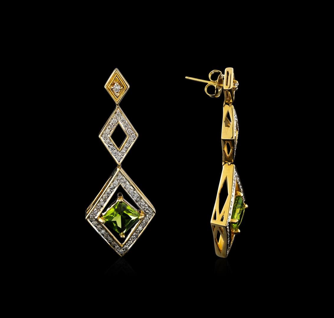 One pair electronically tested 14KT yellow gold ladies cast & assembled peridot and diamond dangle earrings with standard backs. Each earring features a peridot set within a diamond set bezel, completed by matching diamond set links. Bright polish finish with rhodium accents. Identified with markings of "14K". Condition is good. Containing: Two prong set square brilliant cut natural peridots, measuring 6.75 x 6.70 x 4.50mm, approximate total weight of 3.40ct., clarity is eye clean, type II, medium dark, moderately strong, yellowish green color, (GIA yG 6/4), cut is good. Transmitting light with no distortion, transparent. Measurements & the color grade are an average for the pair. Graded in the setting. Ninety-Eight prong set round brilliant cut diamonds, measuring 1.10 - 1.10 x 0.66mm (depth est.) approximate total weight of 98 Stones = 0.55ct. Graded in the setting. Clarity: I-1 to I-2. Color: H - J. Total Weight of Colored Stones 3.40ct. Total Weight of Diamonds 0.55ct. Total Weight of Earrings 8.51gm. AIG Appraised at $4,020.00.