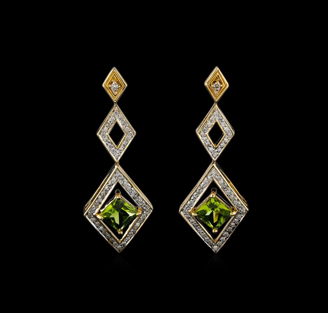 One pair electronically tested 14KT yellow gold ladies cast & assembled peridot and diamond dangle earrings with standard backs. Each earring features a peridot set within a diamond set bezel, completed by matching diamond set links. Bright polish finish with rhodium accents. Identified with markings of "14K". Condition is good. Containing: Two prong set square brilliant cut natural peridots, measuring 6.75 x 6.70 x 4.50mm, approximate total weight of 3.40ct., clarity is eye clean, type II, medium dark, moderately strong, yellowish green color, (GIA yG 6/4), cut is good. Transmitting light with no distortion, transparent. Measurements & the color grade are an average for the pair. Graded in the setting. Ninety-Eight prong set round brilliant cut diamonds, measuring 1.10 - 1.10 x 0.66mm (depth est.) approximate total weight of 98 Stones = 0.55ct. Graded in the setting. Clarity: I-1 to I-2. Color: H - J. Total Weight of Colored Stones 3.40ct. Total Weight of Diamonds 0.55ct. Total Weight of Earrings 8.51gm. AIG Appraised at $4,020.00.