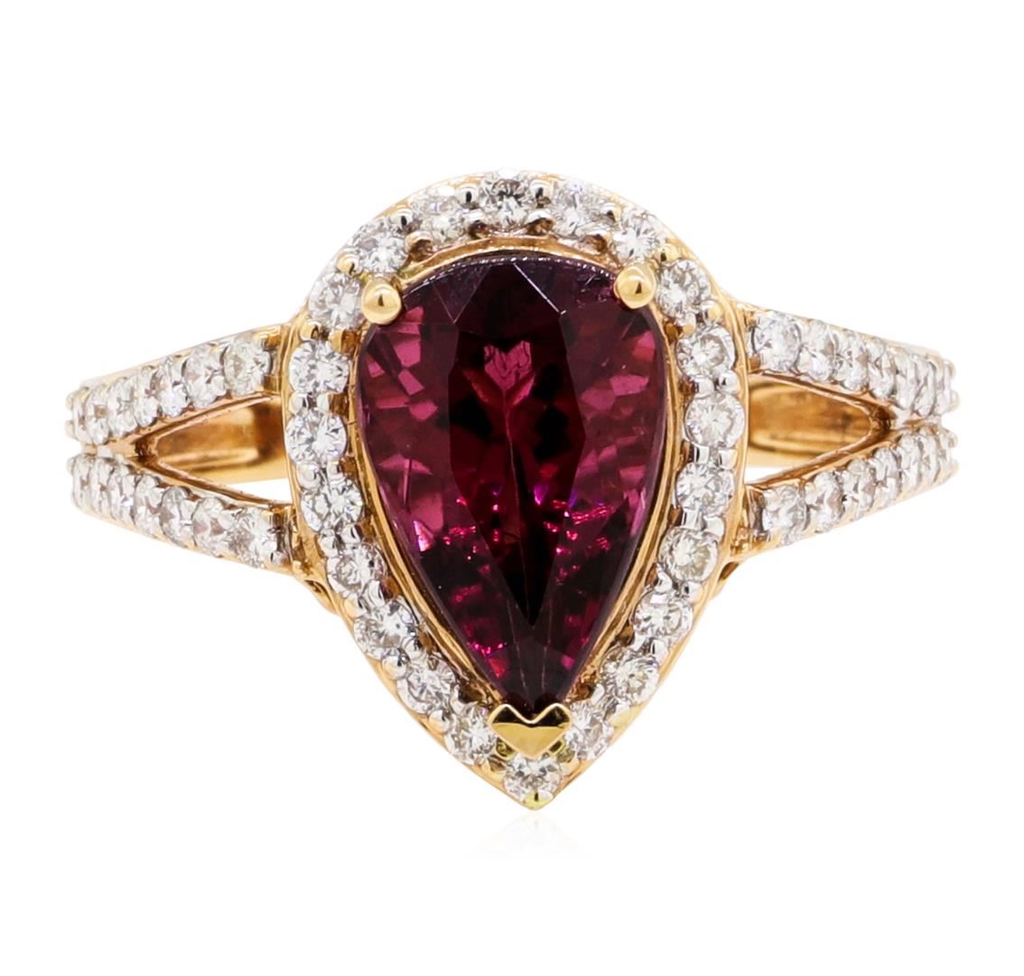 One electronically tested 18KT rose gold lady's cast fashion ring with a split shank halo with a bright polish finish. The featured lady's ring has a shank measuring 2.25 millimeters wide. Identified with markings of '18K'. Condition is new, good workmanship. Containing: One prong set pear modified brilliant cut natural rubellite, measuring 11.11 x 7.46 x 5.85mm, (depth est.) approximate weight of 2.76ct., clarity is eye clean, medium dark, strong, slightly purplish red color, (GIA slpR 6/5), cut is very good. Transmitting light with no distortion, transparent. Colored gemstones are presumed to have been subjected to commonly used enhancement processes. Graded in the setting. Fifty prong set round brilliant cut diamonds, measuring 1.60 - 1.50 x 0.93mm (depth est.) approximate total weight of 50 Stones = 0.64ct. Graded in the setting. Color G - I Clarity SI-1 to SI-2 Cut Good. Total Weight of Colored Stones 2.76ct.. Total Weight of Diamonds 0.64ct.. Total Weight of Ring 5.50gm GAS Appraised at $5925.00. GAS Appraised at $5,925.00.