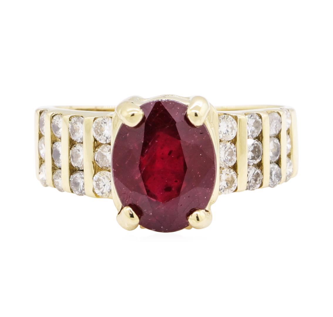 One electronically tested 14KT yellow gold lady's cast fashion ring with a tapered shank with a bright polish finish. The featured lady's ring has a shank measuring 2.90 millimeters wide. Identified with markings of '14K'. Condition is new, good workmanship. Containing: One prong set oval modified mixed cut natural ruby-glass composite, measuring 9.13 x 7.12 x 4.90mm, (depth est.) 5%. bulge factor, approximate weight of 2.82ct., clarity is severely included, medium dark, very slightly brownish, red color, (GIA R 6/3), cut is good. Transmitting light diffusely, opaque to translucent. Naturally occurring internal & external characteristics are present. Indications of laboratory high temperature heat treatment, with glass & flux additives. Colored gemstones are presumed to have been subjected to commonly used enhancement processes. Graded in the setting. Twenty-Four channel set round brilliant cut diamonds, measuring 1.90 - 1.80 x 1.15mm (depth est.) approximate total weight of 24 Stones = 0.58ct. One diamond is chipped. Graded in the setting. Color I - J Clarity SI-2 to I-1 Cut Good. Total Weight of Colored Stones 2.82ct.. Total Weight of Diamonds 0.58ct.. Total Weight of Ring 5.10gm GAS Appraised at $1880.00. GAS Appraised at $1,880.00.