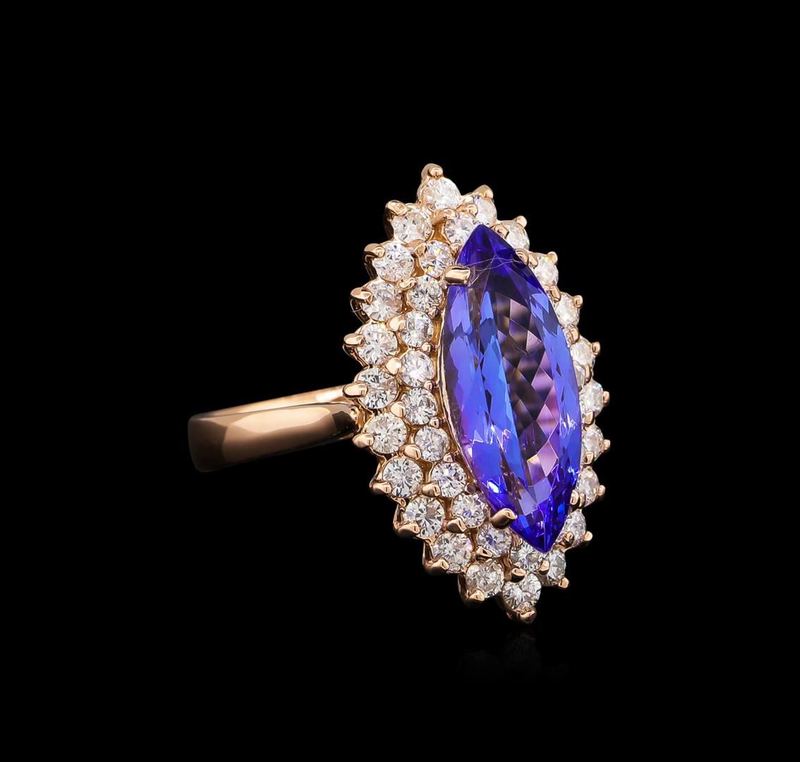 One electronically tested 14KT rose gold lady's cast fashion ring with a double basket halo with a bright polish finish. The featured lady's ring has a shank measuring 2.75 millimeters wide. Identified with markings of "K14". Condition is new, good workmanship. Containing: One prong set marquise modified brilliant cut natural tanzanite, measuring 16.54 x 6.87 x 4.44mm, 6%. bulge factor, approximate weight of 3.40ct., clarity is eye clean, type I, medium, moderately strong, bluish violet color, (GIA bV 5/4), cut is very good. Transmitting light with no distortion, transparent. Colored gemstones are presumed to have been subjected to commonly used enhancement processes. Graded in the setting. Twenty-Two prong set round brilliant cut diamonds, measuring 2.10 - 2.00 x 1.23mm (depth est.) approximate total weight of 22 Stones = 0.68ct. Graded in the setting. Clarity: SI-1 to SI-2. Color: H - I. Cut Good Twenty prong set round brilliant cut diamonds, measuring 1.90 - 1.80 x 1.15mm (depth est.) approximate total weight of 20 Stones = 0.48ct. Graded in the setting. Clarity: SI-1 to SI-2. Color: H - I. Cut Good. Total Weight of Colored Stones 3.40ct. Total Weight of Diamonds 1.16ct. Total Weight of Ring 6.60gm. GAS Appraised at $8,905.00.