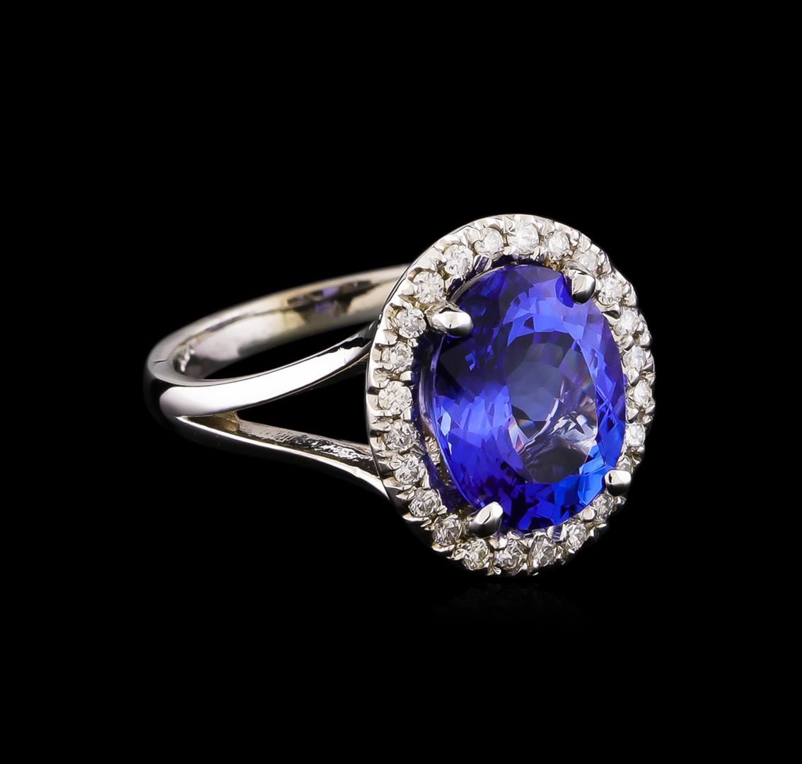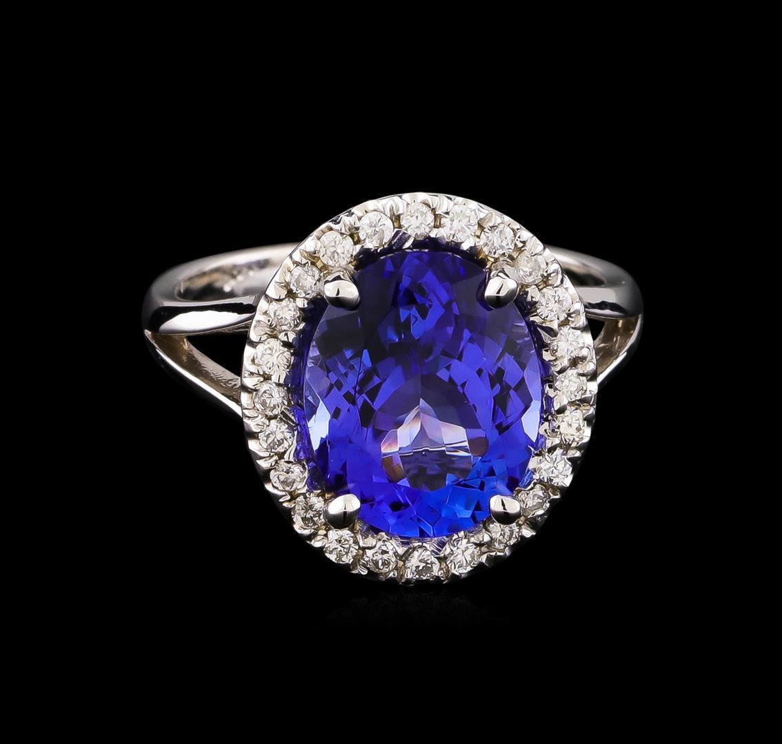 One electronically tested 14KT white gold lady's cast fashion ring with a split shank halo with a bright polish finish. The featured lady's ring has a shank measuring 2.16 millimeters wide. Identified with markings of "14K". Condition is new, good workmanship. Containing: One prong set oval modified brilliant cut natural tanzanite, measuring 10.78 x 8.65 x 5.23mm, approximate weight of 3.40ct., clarity is eye clean, medium dark, moderately strong, violetish blue color, (GIA vB 6/4), cut is very good. Transmitting light with no distortion, transparent. Colored gemstones are presumed to have been subjected to commonly used enhancement processes. Graded in the setting. Twenty-Four prong set round brilliant cut diamonds, measuring 1.40 - 1.35 x 0.86mm (depth est.) approximate total weight of 24 Stones = 0.24ct. Graded in the setting. Clarity: SI-1 to SI-2. Color: G - I. Cut Good. Total Weight of Colored Stones 3.40ct. Total Weight of Diamonds 0.24ct. Total Weight of Ring 4.20gm. GAS Appraised at $7,190.00.