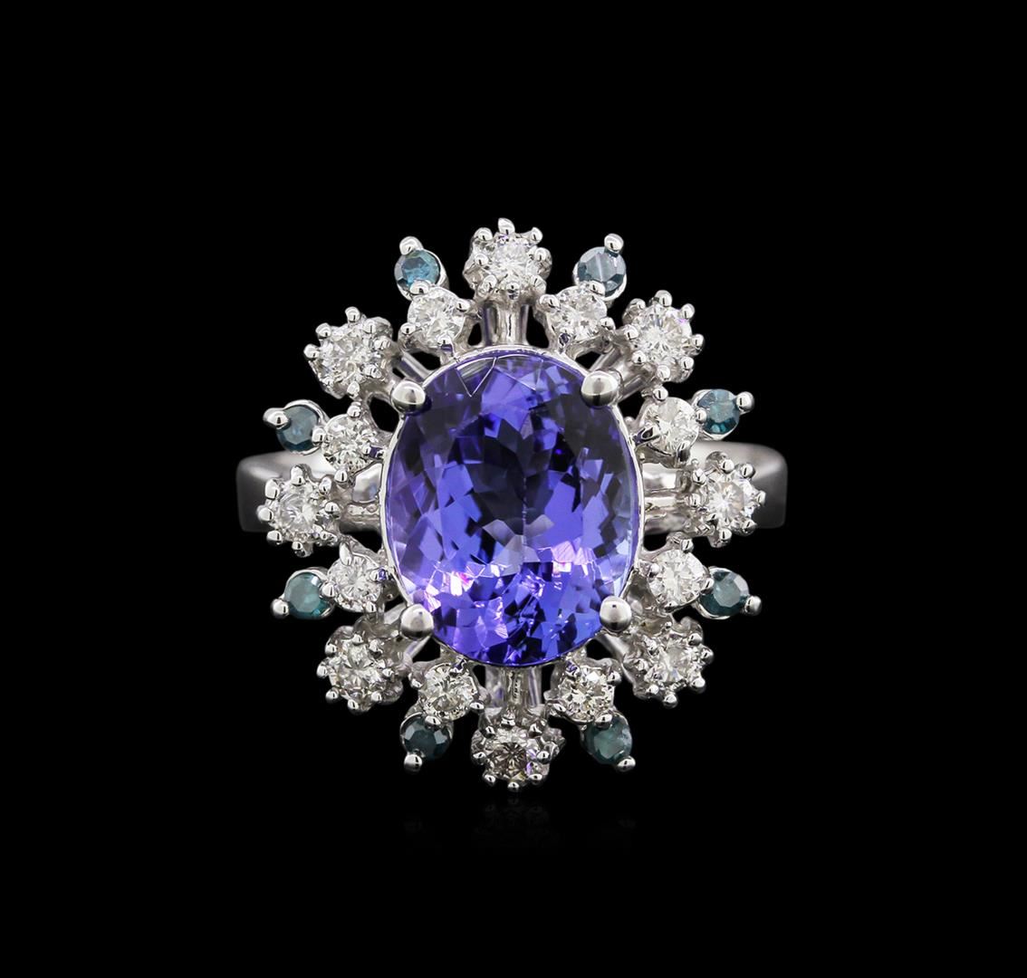 One electronically tested 14KT white gold lady's cast fashion ring with a basket setting with a bright polish finish. The featured ring has a 3.00mm shank Identified with markings of "K14". Condition is new, good workmanship. Containing: One prong set oval modified brilliant cut natural tanzanite, measuring 10.65 x 8.20 x 5.25mm, 5% bulge factor, approximate weight of 3.40ct., clarity is eye clean, type I, medium, very slightly grayish, bluish violet color, (GIA bV 5/3), cut is very good. Transmitting light with a minimum of distortion, transparent. Colored gemstones are presumed to have been subjected to commonly used enhancement processes. Graded in the setting. Sixteen prong set round brilliant cut diamonds, measuring 2.10 - 2.00 x 1.33mm (depth est.) approximate total weight of 16 Stones = 0.52ct. Graded in the setting. Clarity: SI-1 to I-1. Color: H - I. Cut Good Eight prong set round brilliant cut diamonds, measuring 1.70 - 1.65 x 1.09mm (depth est.) approximate total weight of 8 Stones = 0.15ct. Graded in the setting. Clarity: SI-2 to I-1 Cut Good. Total Weight of Colored Stones 3.40ct. Total Weight of Diamonds 0.67ct. Total Weight of Ring 6.00gm. GAS Appraised at $8,455.00.