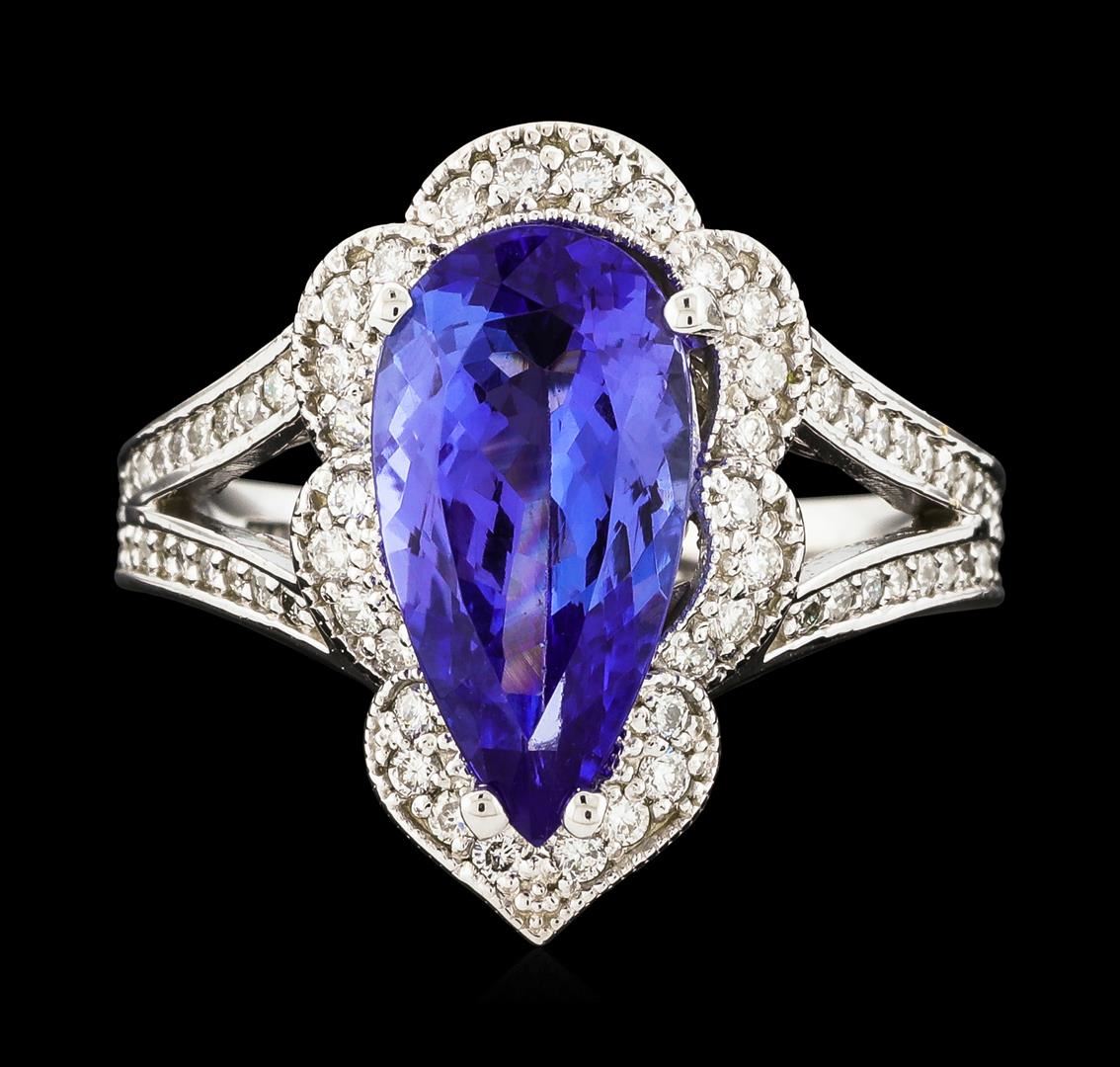One electronically tested 14KT white gold lady's cast fashion ring with a split shank scalloped basket halo with a bright polish with milgrain detailing finish. The featured lady's ring has a shank measuring 2.93 millimeters wide. Identified with markings of 'K14'. Condition is new, good workmanship. Containing: One prong set pear modified brilliant cut natural tanzanite, measuring 14.47 x 7.47 x 4.81mm, (depth est.) approximate weight of 3.40ct., clarity is eye clean, medium, moderately strong, violetish blue color, (GIA vB 5/4), cut is good. Transmitting light with no distortion, transparent. Colored gemstones are presumed to have been subjected to commonly used enhancement processes. Graded in the setting. Twenty-Eight prong set round brilliant cut diamonds, measuring 1.40 - 1.35 x 0.86mm (depth est.) approximate total weight of 28 Stones = 0.28ct. Graded in the setting. Clarity SI-1 to SI-2. Color: H - I Cut Good Forty-Four prong set round brilliant cut diamonds, measuring 1.20 - 1.15 x 0.73mm (depth est.) approximate total weight of 44 Stones = 0.28ct. Graded in the setting. Clarity SI-1 to I-1. Color: H - I Cut Good. Total Weight of Colored Stones 3.40ct.. Total Weight of Diamonds 0.56ct.. Total Weight of Ring 7.10gm. GAS Appraised at $7,015.00.