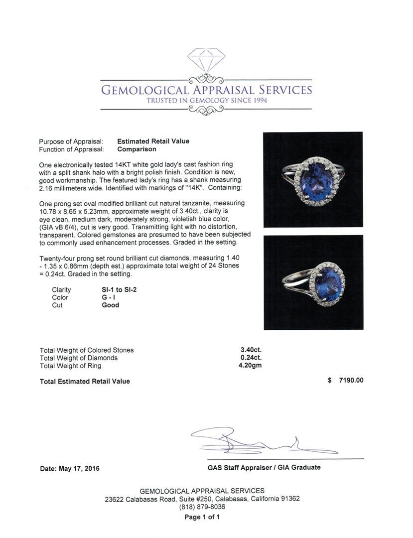 One electronically tested 14KT white gold lady's cast fashion ring with a split shank halo with a bright polish finish. The featured lady's ring has a shank measuring 2.16 millimeters wide. Identified with markings of "14K". Condition is new, good workmanship. Containing: One prong set oval modified brilliant cut natural tanzanite, measuring 10.78 x 8.65 x 5.23mm, approximate weight of 3.40ct., clarity is eye clean, medium dark, moderately strong, violetish blue color, (GIA vB 6/4), cut is very good. Transmitting light with no distortion, transparent. Colored gemstones are presumed to have been subjected to commonly used enhancement processes. Graded in the setting. Twenty-Four prong set round brilliant cut diamonds, measuring 1.40 - 1.35 x 0.86mm (depth est.) approximate total weight of 24 Stones = 0.24ct. Graded in the setting. Clarity: SI-1 to SI-2. Color: G - I. Cut Good. Total Weight of Colored Stones 3.40ct. Total Weight of Diamonds 0.24ct. Total Weight of Ring 4.20gm. GAS Appraised at $7,190.00.