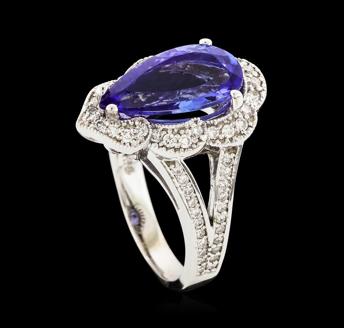 One electronically tested 14KT white gold lady's cast fashion ring with a split shank scalloped basket halo with a bright polish with milgrain detailing finish. The featured lady's ring has a shank measuring 2.93 millimeters wide. Identified with markings of 'K14'. Condition is new, good workmanship. Containing: One prong set pear modified brilliant cut natural tanzanite, measuring 14.47 x 7.47 x 4.81mm, (depth est.) approximate weight of 3.40ct., clarity is eye clean, medium, moderately strong, violetish blue color, (GIA vB 5/4), cut is good. Transmitting light with no distortion, transparent. Colored gemstones are presumed to have been subjected to commonly used enhancement processes. Graded in the setting. Twenty-Eight prong set round brilliant cut diamonds, measuring 1.40 - 1.35 x 0.86mm (depth est.) approximate total weight of 28 Stones = 0.28ct. Graded in the setting. Clarity SI-1 to SI-2. Color: H - I Cut Good Forty-Four prong set round brilliant cut diamonds, measuring 1.20 - 1.15 x 0.73mm (depth est.) approximate total weight of 44 Stones = 0.28ct. Graded in the setting. Clarity SI-1 to I-1. Color: H - I Cut Good. Total Weight of Colored Stones 3.40ct.. Total Weight of Diamonds 0.56ct.. Total Weight of Ring 7.10gm. GAS Appraised.