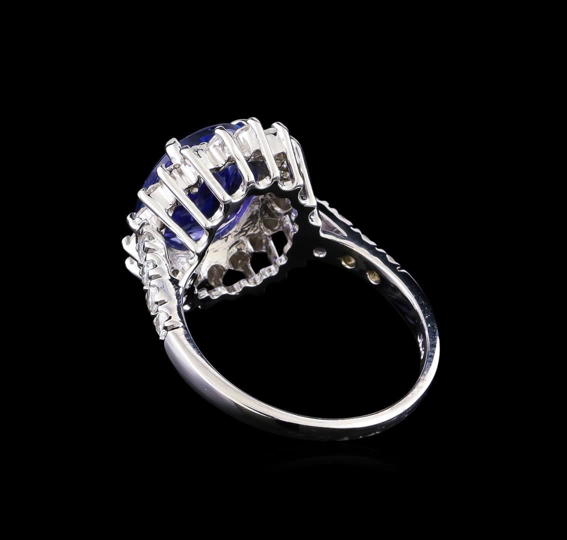 One electronically tested 14KT white gold lady's cast fashion ring with a basket halo with a bright polish finish. The featured lady's ring has a shank measuring 1.66 millimeters in width. Identified with markings of "K14". Condition is new, good workmanship. Containing: One prong set oval oval modified brilliant cut natural tanzanite, measuring 11.14 x 8.79 x 4.88mm, (depth est.) approximate weight of 3.40 ct., clarity is eye clean, medium, moderately strong, violetish blue color, (GIA vB 5/4), cut is very good. Transmitting light with no distortion, transparent. Colored gemstones are presumed to have been subjected to commonly used enhancement processes. Graded in the setting. Twenty-Six prong set round brilliant cut diamonds, measuring 2.00 - 1.95 x 1.19mm (depth est.) approximate total weight of 26 Stones = 0.75ct. Graded in the setting. Clarity: SI-1 to SI-2. Color: G - Good. Total Weight of Colored Stones 3.40 ct. Total Weight of Diamonds 0.75ct. Total Weight of Ring 4.70gm.