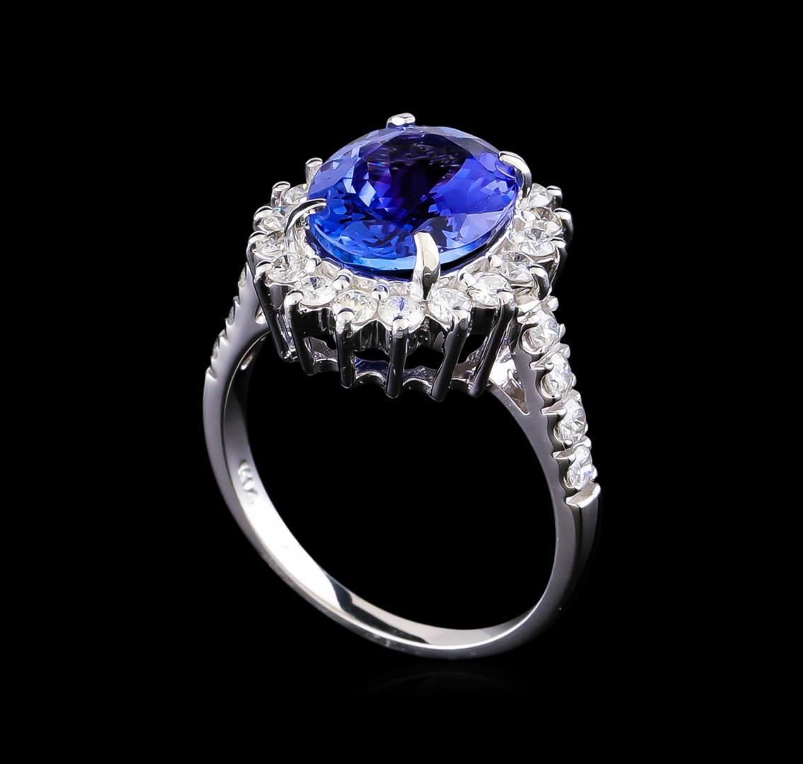 One electronically tested 14KT white gold lady's cast fashion ring with a basket halo with a bright polish finish. The featured lady's ring has a shank measuring 1.66 millimeters in width. Identified with markings of "K14". Condition is new, good workmanship. Containing: One prong set oval oval modified brilliant cut natural tanzanite, measuring 11.14 x 8.79 x 4.88mm, (depth est.) approximate weight of 3.40 ct., clarity is eye clean, medium, moderately strong, violetish blue color, (GIA vB 5/4), cut is very good. Transmitting light with no distortion, transparent. Colored gemstones are presumed to have been subjected to commonly used enhancement processes. Graded in the setting. Twenty-Six prong set round brilliant cut diamonds, measuring 2.00 - 1.95 x 1.19mm (depth est.) approximate total weight of 26 Stones = 0.75ct. Graded in the setting. Clarity: SI-1 to SI-2. Color: G - Good. Total Weight of Colored Stones 3.40 ct. Total Weight of Diamonds 0.75ct. Total Weight of Ring 4.70gm.