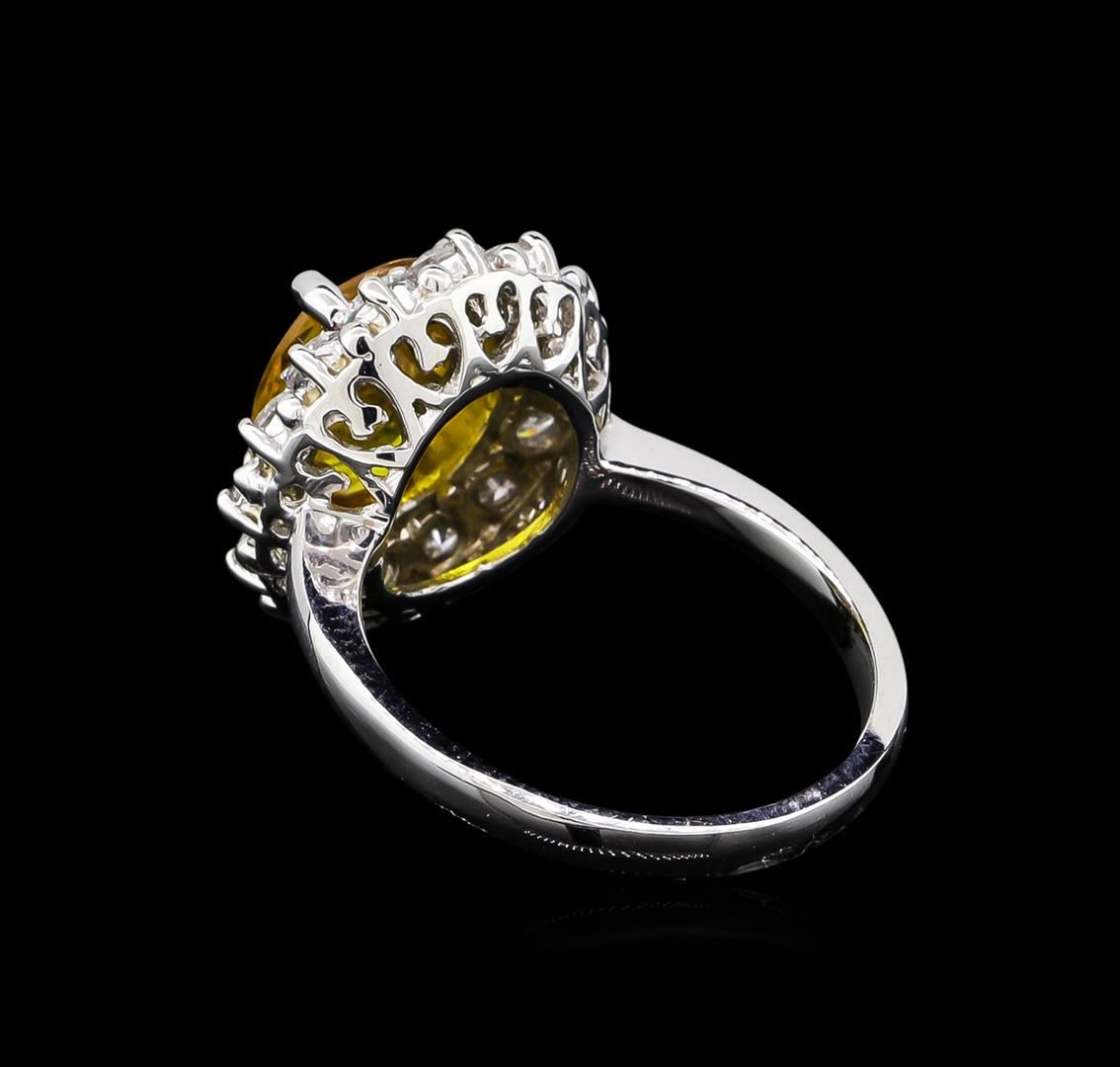14K White Gold 0.70CT Sapphire 0.90CT Diamond Ring. Description: Metal: 14k solid white gold. Face Measurements: 15 x 17mm. Size: 7.25. Shank Width: 2.5mm. Finish: bright polish. Total Item Weight: 5.5 grams. Markings: stamped 14K. Country Made: USA. Main Stone: sapphire. Quantity: 1. Shape: oval. Color: yellow. Carat Total Weight: 3.40. Measurements: 8 x 11mm. Treatment: heating. Setting: prong. Hue: yellowish orange. Saturation: moderately strong. Tone: dark. Clarity: type 2. Cut: very good. Secondary Stone: diamond. Quantity: 14. Shape: round. Color: white. Carat Total Weight: 1.10. Measurements: 2.6mm. Treatment: none. Setting: prong. Color Grade: G-H. Clarity: SI1-SI2. Cut: very good. Excellent Workmanship. Gemstones graded in the mounting. BHGL Appraised at $13,980.00.