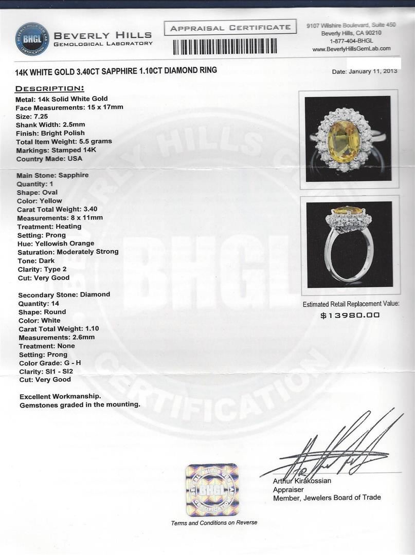 14K White Gold 0.70CT Sapphire 0.90CT Diamond Ring. Description: Metal: 14k solid white gold. Face Measurements: 15 x 17mm. Size: 7.25. Shank Width: 2.5mm. Finish: bright polish. Total Item Weight: 5.5 grams. Markings: stamped 14K. Country Made: USA. Main Stone: sapphire. Quantity: 1. Shape: oval. Color: yellow. Carat Total Weight: 3.40. Measurements: 8 x 11mm. Treatment: heating. Setting: prong. Hue: yellowish orange. Saturation: moderately strong. Tone: dark. Clarity: type 2. Cut: very good. Secondary Stone: diamond. Quantity: 14. Shape: round. Color: white. Carat Total Weight: 1.10. Measurements: 2.6mm. Treatment: none. Setting: prong. Color Grade: G-H. Clarity: SI1-SI2. Cut: very good. Excellent Workmanship. Gemstones graded in the mounting. BHGL Appraised at $13,980.00.