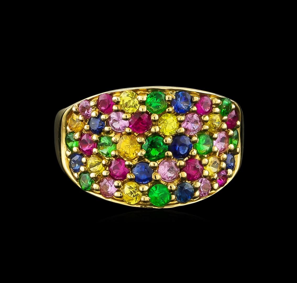 One electronically tested 9KT yellow gold ladies cast multi gemstone ring with a bright polish finish. The ring features a colorful gallery of blue sapphires, yellow sapphires, pink sapphires, tsavorite garnets and laboratory created rubies supported by tapering shoulders, completed by a two millimeter wide band. Trademark is QVC. Identified with markings of "375". Condition is new, good workmanship. Containing: Twenty-two prong set round mixed cut natural multicolor sapphires, measuring 2.70 - 1.90 x 1.50 mm, approximate total weight of 1.80ct., clarity is eye clean, cut is good. The group contains a mix of blue, yellow and pink sapphires. Transmitting light with no distortion, transparent. Graded in the setting. Nine prong set round mixed cut natural tsavorite garnets, measuring 2.80 - 1.90 x 1.53 mm, approximate total weight of 0.81ct., clarity is eye clean, type II, medium dark, moderately strong, slightly yellowish green color, (GIA slyG 6/4), cut is good. Transmitting light with no distortion, transparent. Color grade is an average for the group. Graded in the setting. Eight prong set round mixed cut laboratory created rubies, measuring 2.90 - 1.90 x 1.56 mm, approximate total weight of 0.80ct., clarity is eye clean, type II, medium dark, moderately strong, slightly purplish red color, (GIA slpR 6/4), cut is good. Transmitting light with no distortion, transparent. Color grade is an average for the group. Graded in the setting. Total Weight of Colored Stones 3.41ct. Total Weight of Ring 3.25gm. AIG Appraised at $1,395.00.