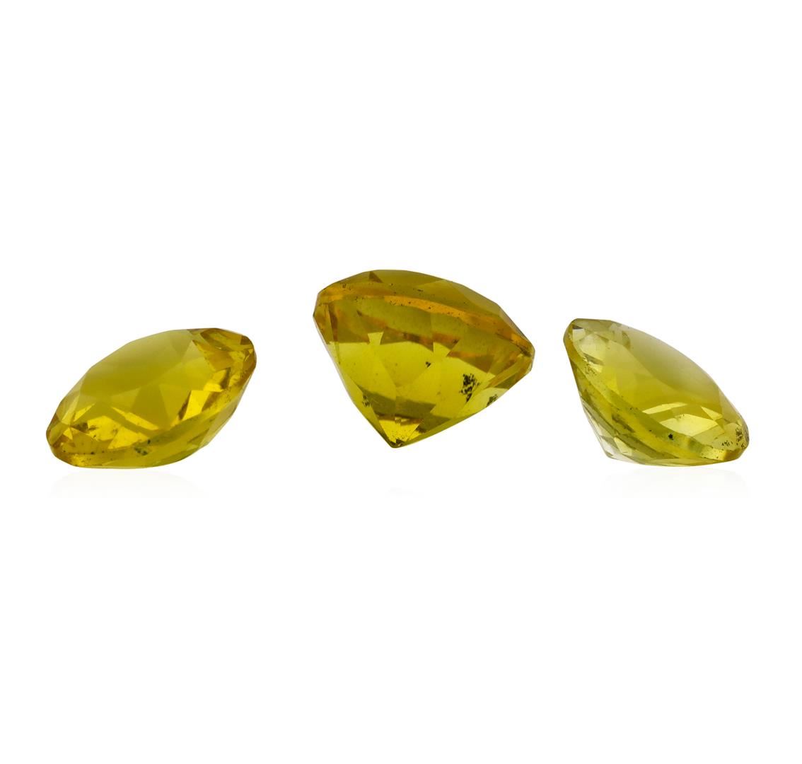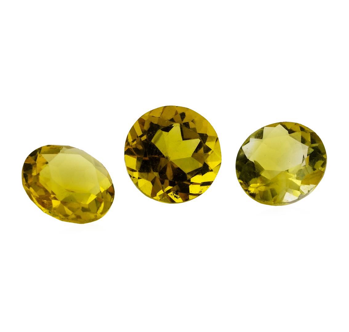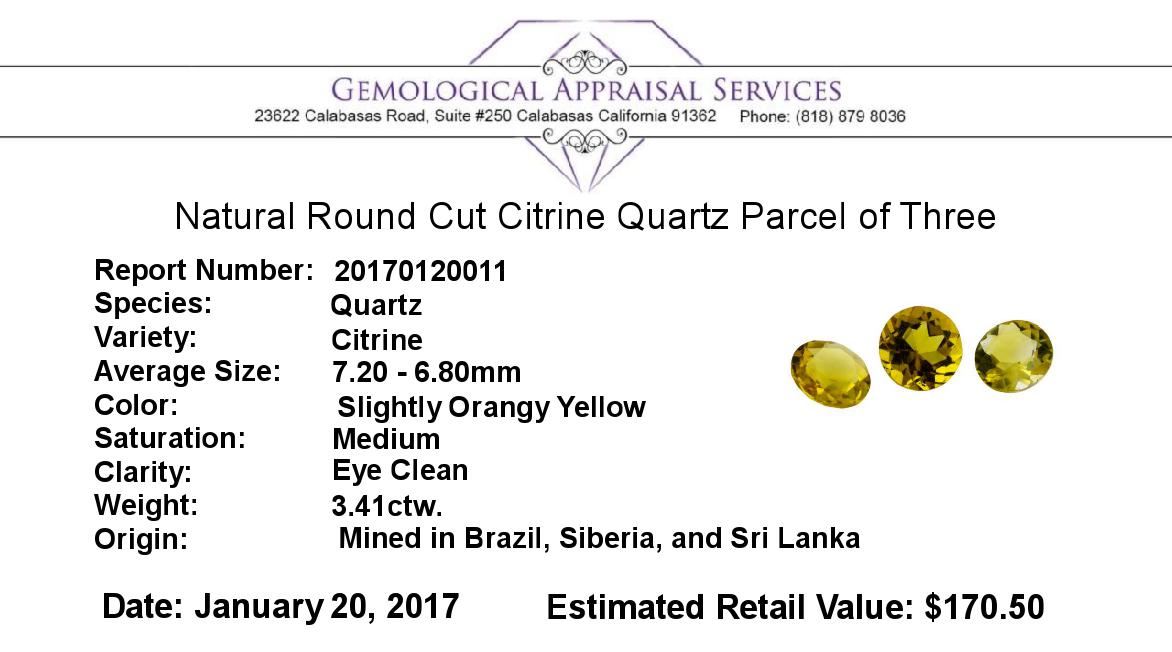 One natural round cut citrine quartz parcel of three with an exact weight of 3.41ctw., clarity is eye clean, slightly orangy yellow, medium. Gemological Appraisals Services estimates the retail value at $170.5 GAS Appraised.
