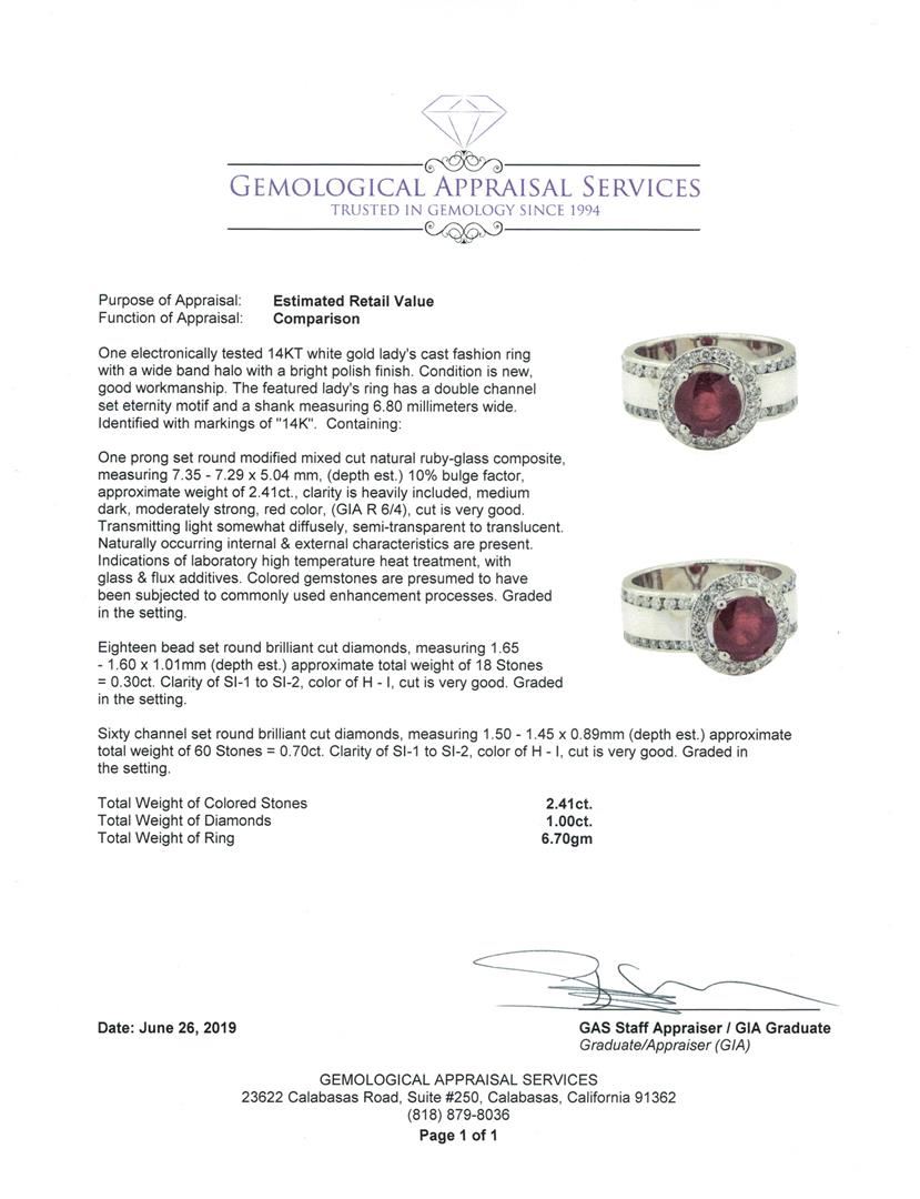 One electronically tested 14KT white gold lady's cast fashion ring with a wide band halo with a bright polish finish. The featured lady's ring has a double channel set eternity motif and a shank measuring 6.80 millimeters wide. Identified with markings of '14K'. Condition is new, good workmanship. Containing: One prong set round modified mixed cut natural ruby-glass composite, measuring 7.35 - 7.29 x 5.04 mm, (depth est.) 10%. bulge factor, approximate weight of 2.41ct., clarity is heavily included, medium dark, moderately strong, red color, (GIA R 6/4), cut is very good. Transmitting light somewhat diffusely, semi-transparent to translucent. Naturally occurring internal & external characteristics are present. Indications of laboratory high temperature heat treatment, with glass & flux additives. Colored gemstones are presumed to have been subjected to commonly used enhancement processes. Graded in the setting. Eighteen bead set round brilliant cut diamonds, measuring 1.65 - 1.60 x 1.01mm (depth est.) approximate total weight of 18 Stones = 0.30ct. Graded in the setting. Color H - I Clarity SI-1 to SI-2 Cut Very Good Sixty channel set round brilliant cut diamonds, measuring 1.50 - 1.45 x 0.89mm (depth est.) approximate total weight of 60 Stones = 0.70ct. Graded in the setting. Color H - I Clarity SI-1 to SI-2 Cut Very Good. Total Weight of Colored Stones 2.41ct.. Total Weight of Diamonds 1.00ct.. Total Weight of Ring 6.70gm GAS Appraised at $4230.00. GAS Appraised at $4,230.00.