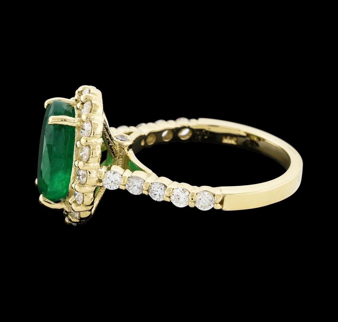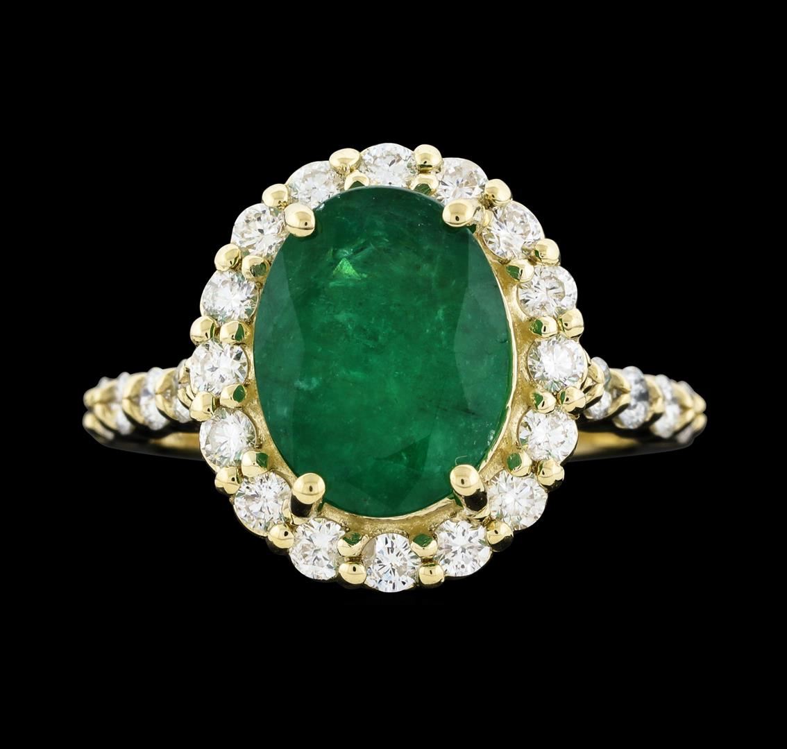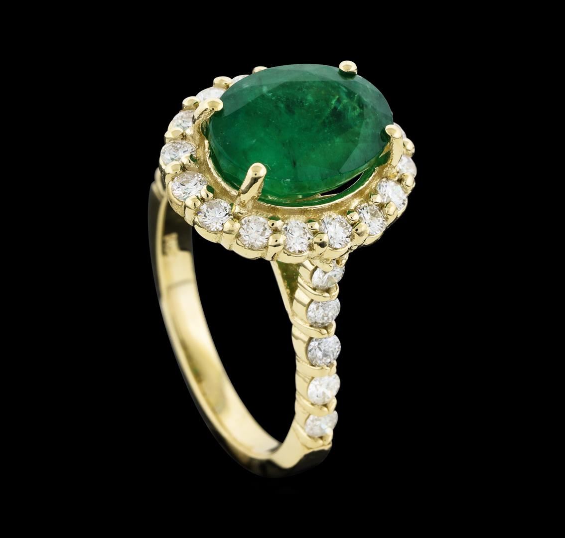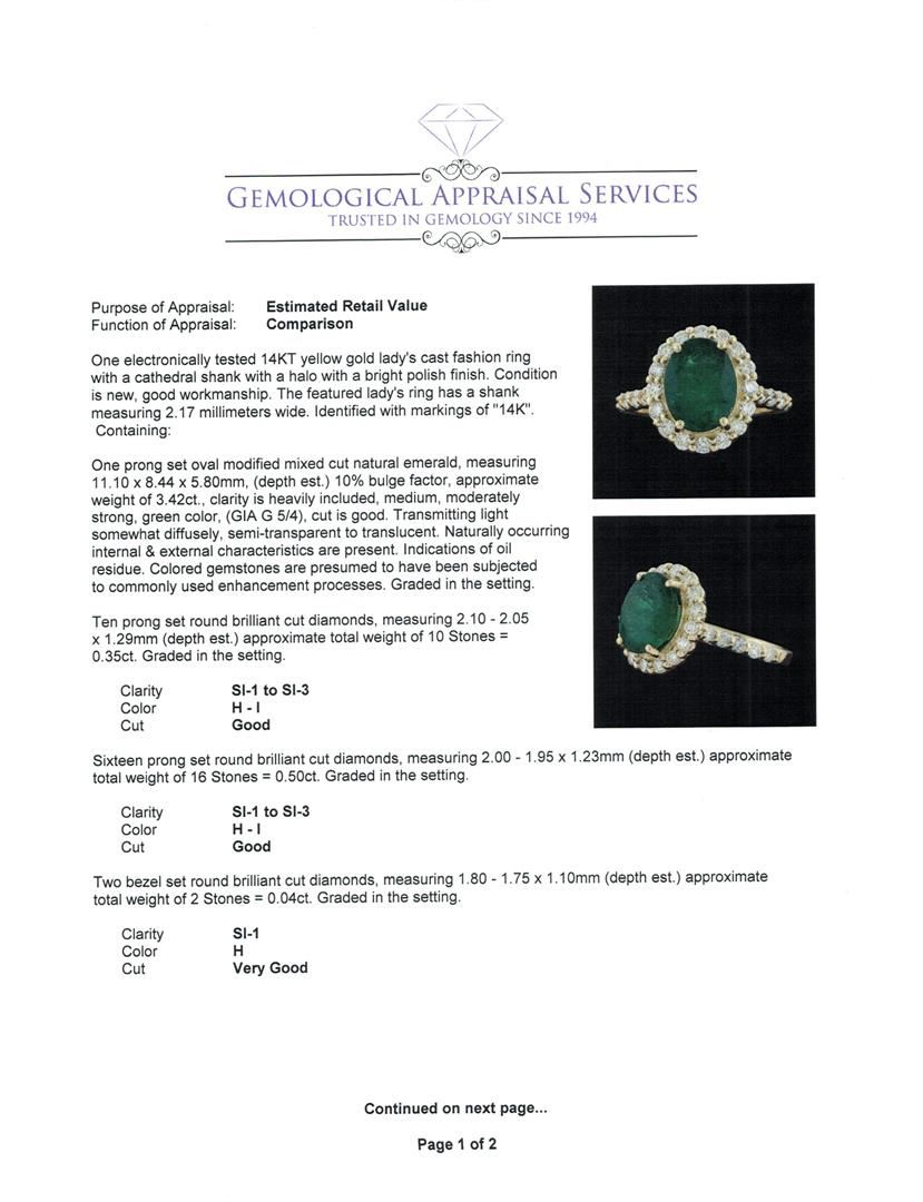 One electronically tested 14KT yellow gold lady's cast fashion ring with a cathedral shank with a halo with a bright polish finish. The featured lady's ring has a shank measuring 2.17 millimeters wide. Identified with markings of '14K'. Condition is new, good workmanship. Containing: One prong set oval modified mixed cut natural emerald, measuring 11.10 x 8.44 x 5.80mm, (depth est.) 10%. bulge factor, approximate weight of 3.42ct., clarity is heavily included, medium, moderately strong, green color, (GIA G 5/4), cut is good. Transmitting light somewhat diffusely, semi-transparent to translucent. Naturally occurring internal & external characteristics are present. Indications of oil residue. Colored gemstones are presumed to have been subjected to commonly used enhancement processes. Graded in the setting. Ten prong set round brilliant cut diamonds, measuring 2.10 - 2.05 x 1.29mm (depth est.) approximate total weight of 10 Stones = 0.35ct. Graded in the setting. Clarity SI-1 to SI-3. Color: H - I Cut Good Sixteen prong set round brilliant cut diamonds, measuring 2.00 - 1.95 x 1.23mm (depth est.) approximate total weight of 16 Stones = 0.50ct. Graded in the setting. Clarity SI-1 to SI-3. Color: H - I Cut Good Two bezel set round brilliant cut diamonds, measuring 1.80 - 1.75 x 1.10mm (depth est.) approximate total weight of 2 Stones = 0.04ct. Graded in the setting. Clarity SI-1. Color: H Cut Very Good. Total Weight of Colored Stones 3.42ct.. Total Weight of Diamonds 0.89ct.. Total Weight of Ring 5.40gm. GAS Appraised at $5,205.00.