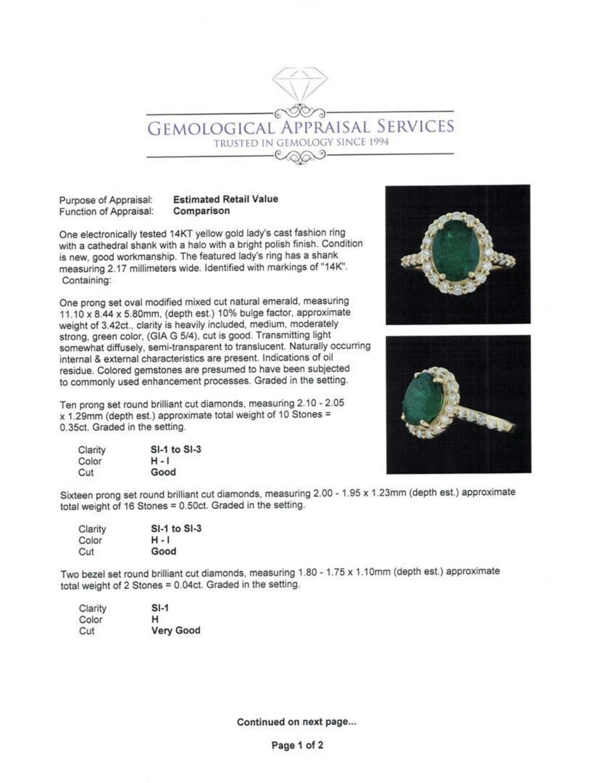 One electronically tested 14KT yellow gold lady's cast fashion ring with a cathedral shank with a halo with a bright polish finish. The featured lady's ring has a shank measuring 2.17 millimeters wide. Identified with markings of '14K'. Condition is new, good workmanship. Containing: One prong set oval modified mixed cut natural emerald, measuring 11.10 x 8.44 x 5.80mm, (depth est.) 10%. bulge factor, approximate weight of 3.42ct., clarity is heavily included, medium, moderately strong, green color, (GIA G 5/4), cut is good. Transmitting light somewhat diffusely, semi-transparent to translucent. Naturally occurring internal & external characteristics are present. Indications of oil residue. Colored gemstones are presumed to have been subjected to commonly used enhancement processes. Graded in the setting. Ten prong set round brilliant cut diamonds, measuring 2.10 - 2.05 x 1.29mm (depth est.) approximate total weight of 10 Stones = 0.35ct. Graded in the setting. Clarity SI-1 to SI-3. Color: H - I Cut Good Sixteen prong set round brilliant cut diamonds, measuring 2.00 - 1.95 x 1.23mm (depth est.) approximate total weight of 16 Stones = 0.50ct. Graded in the setting. Clarity SI-1 to SI-3. Color: H - I Cut Good Two bezel set round brilliant cut diamonds, measuring 1.80 - 1.75 x 1.10mm (depth est.) approximate total weight of 2 Stones = 0.04ct. Graded in the setting. Clarity SI-1. Color: H Cut Very Good. Total Weight of Colored Stones 3.42ct.. Total Weight of Diamonds 0.89ct.. Total Weight of Ring 5.40gm. GAS Appraised.