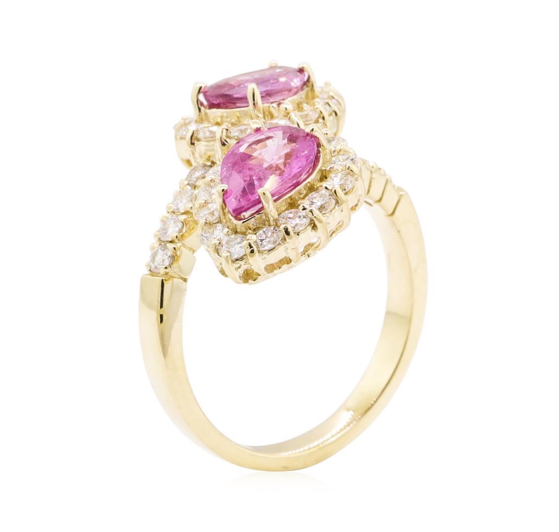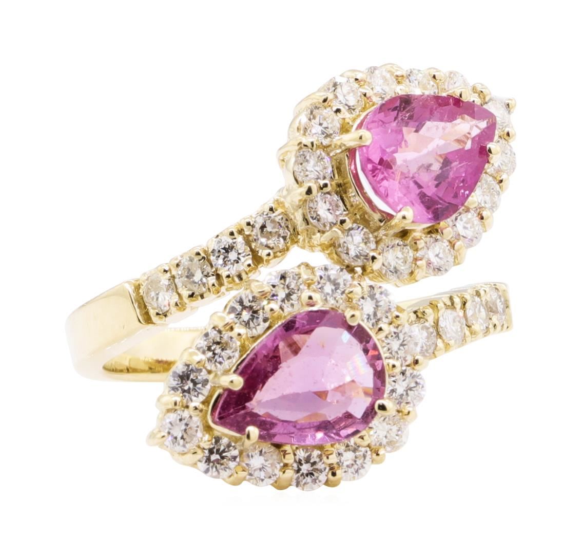 One electronically tested 14KT yellow gold lady's cast fashion ring with a bypass shank with a halo with a bright polish finish. The featured lady's ring has a shank measuring 2.60 millimeters wide. Identified with markings of '14K'. Condition is new, good workmanship. Containing: Two prong set pear modified mixed cut natural pink sapphires, measuring 7.95 x 6.02 x 2.86mm, (depth est.) 5%. bulge factor, approximate total weight of 2.37ct., clarity is slightly included, medium light, moderately strong, slightly purplish red color, (GIA slpR 4/4), cut is good. Transmitting light with a minimum of distortion, transparent. Colored gemstones are presumed to have been subjected to commonly used enhancement processes. Graded in the setting. Thirty-Six prong set round brilliant cut diamonds, measuring 2.00 - 1.95 x 1.23mm (depth est.) approximate total weight of 36 Stones = 1.05ct. Graded in the setting. Color G - I Clarity SI-1 to SI-2 Cut Good. Total Weight of Colored Stones 2.37ct.. Total Weight of Diamonds 1.05ct.. Total Weight of Ring 6.50gm GAS Appraised at $8815.00. GAS Appraised at $8,815.00.