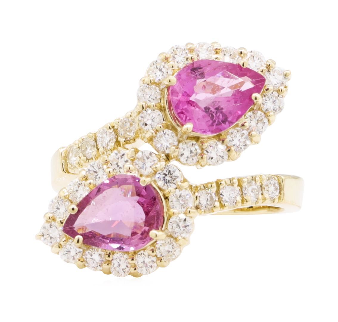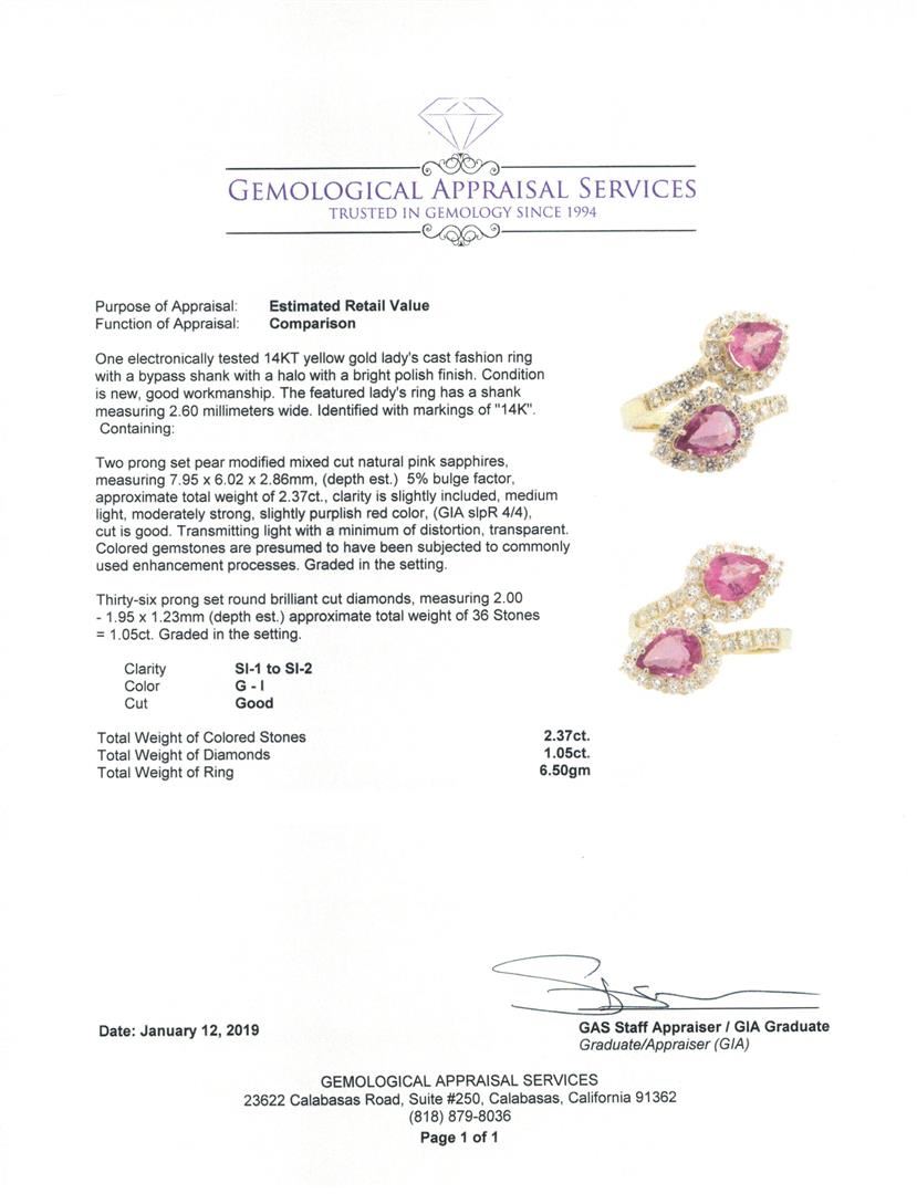 One electronically tested 14KT yellow gold lady's cast fashion ring with a bypass shank with a halo with a bright polish finish. The featured lady's ring has a shank measuring 2.60 millimeters wide. Identified with markings of '14K'. Condition is new, good workmanship. Containing: Two prong set pear modified mixed cut natural pink sapphires, measuring 7.95 x 6.02 x 2.86mm, (depth est.) 5%. bulge factor, approximate total weight of 2.37ct., clarity is slightly included, medium light, moderately strong, slightly purplish red color, (GIA slpR 4/4), cut is good. Transmitting light with a minimum of distortion, transparent. Colored gemstones are presumed to have been subjected to commonly used enhancement processes. Graded in the setting. Thirty-Six prong set round brilliant cut diamonds, measuring 2.00 - 1.95 x 1.23mm (depth est.) approximate total weight of 36 Stones = 1.05ct. Graded in the setting. Color G - I Clarity SI-1 to SI-2 Cut Good. Total Weight of Colored Stones 2.37ct.. Total Weight of Diamonds 1.05ct.. Total Weight of Ring 6.50gm GAS Appraised at $8815.00. GAS Appraised at $8,815.00.