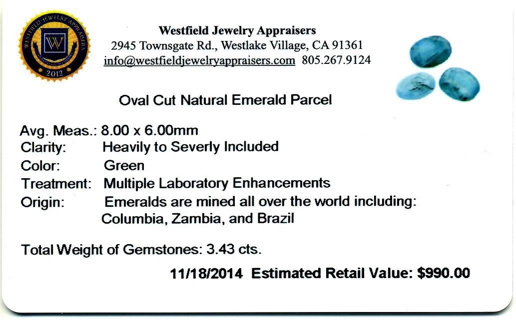 3.43cts. Oval Cut Natural Emerald Parcel Westfield Appraised at $990.00.